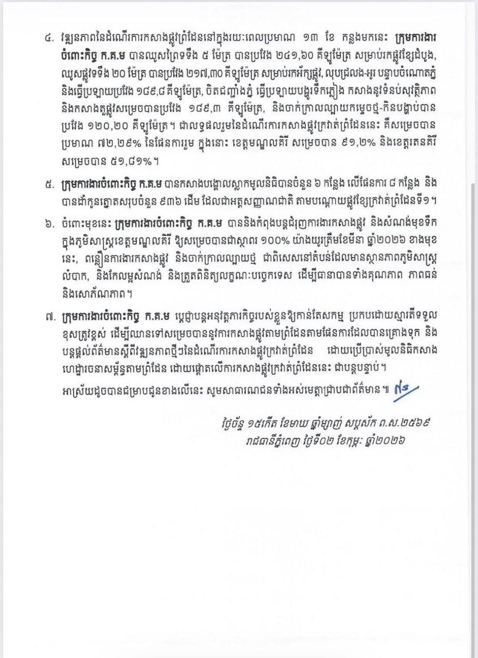 ៦. ចំពោះមុខនេះ ក្រុមការងារចំពោះកិច្ច ក.គ.ម បាននិងកំពុងបន្តជំរុញការងារកសាងផ្លូវ និងសំណង់មុខទឹក ក្នុងភូមិសាស្ត្រខេត្តមណ្ឌលគិរី ឱ្យសម្រេចបានជាស្ថាពរ ១០០% យ៉ាងយូរត្រឹមខែមីនា ឆ្នាំ២០២៦ ខាងមុខ នេះ, ពន្លឿនការងារកសាងផ្លូវ និងចាក់ក្រាលល្បាយថ្ម ជាពិសេសនៅតំបន់ដែលមានស្ថានភាពភូមិសាស្ត្រ លំបាក, និងកែលម្អសំណង់ និងត្រួតពិនិត្យលក្ខណៈបច្ចេកទេស ដើម្បីធានាបានទាំងគុណភាព ភាពធន់ និងសោភ័ណភាព។
