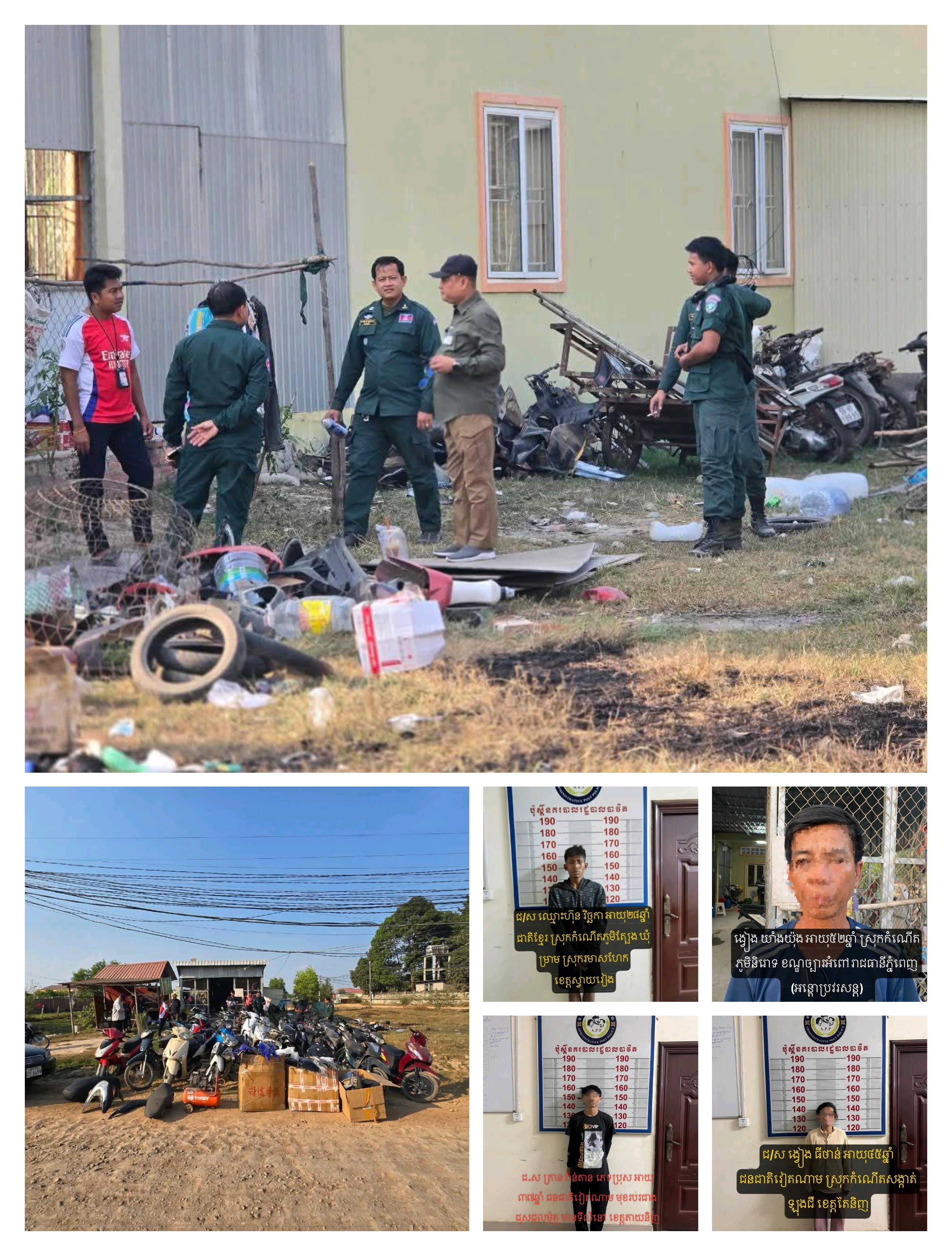និងទី៤ជនសង្ស័យឈ្មោះ ង្វៀង យាំងយ៉ុង ភេទប្រុស អាយុ៥២ឆ្នាំ ស្រុកកំណើតខណ្ឌច្បារអំពៅ រាជធានីភ្នំពេញ ម្ចាស់ផ្ទះ)រួមនិងវត្ថុតាងក្នងផ្ទះ មាន ម៉ូតូចំនួន ២៤គ្រឿង (មាននៅក្នុងកំណត់ហេតុចាប់យក) ។