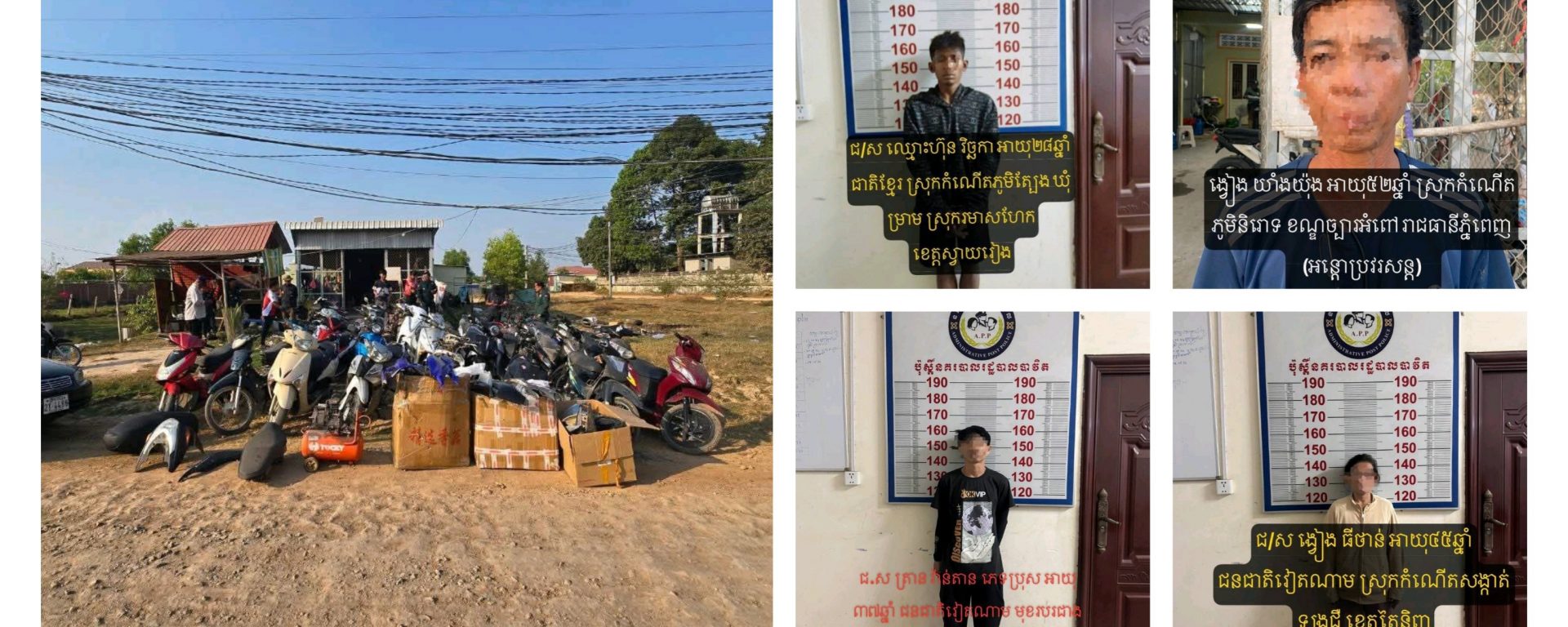 ខេត្តស្វាយរៀង: ជនសង្ស័យទាំង៤នាក់ រួមវត្ថុតាងសរុបម៉ូតូ៣០គ្រឿង សមត្ថកិច្ចបបញ្ជួនមកតុលាការខេត្តករណីលួចមានស្ថានទម្ងន់ទោស (លួច កាច់កម៉ូតូ) និងទទួលផលចោរកម្ម កែឆ្នៃម៉ូតូ គ្មានលិខិតអនុញ្ញាតិ នៅក្រុងបាវិត។