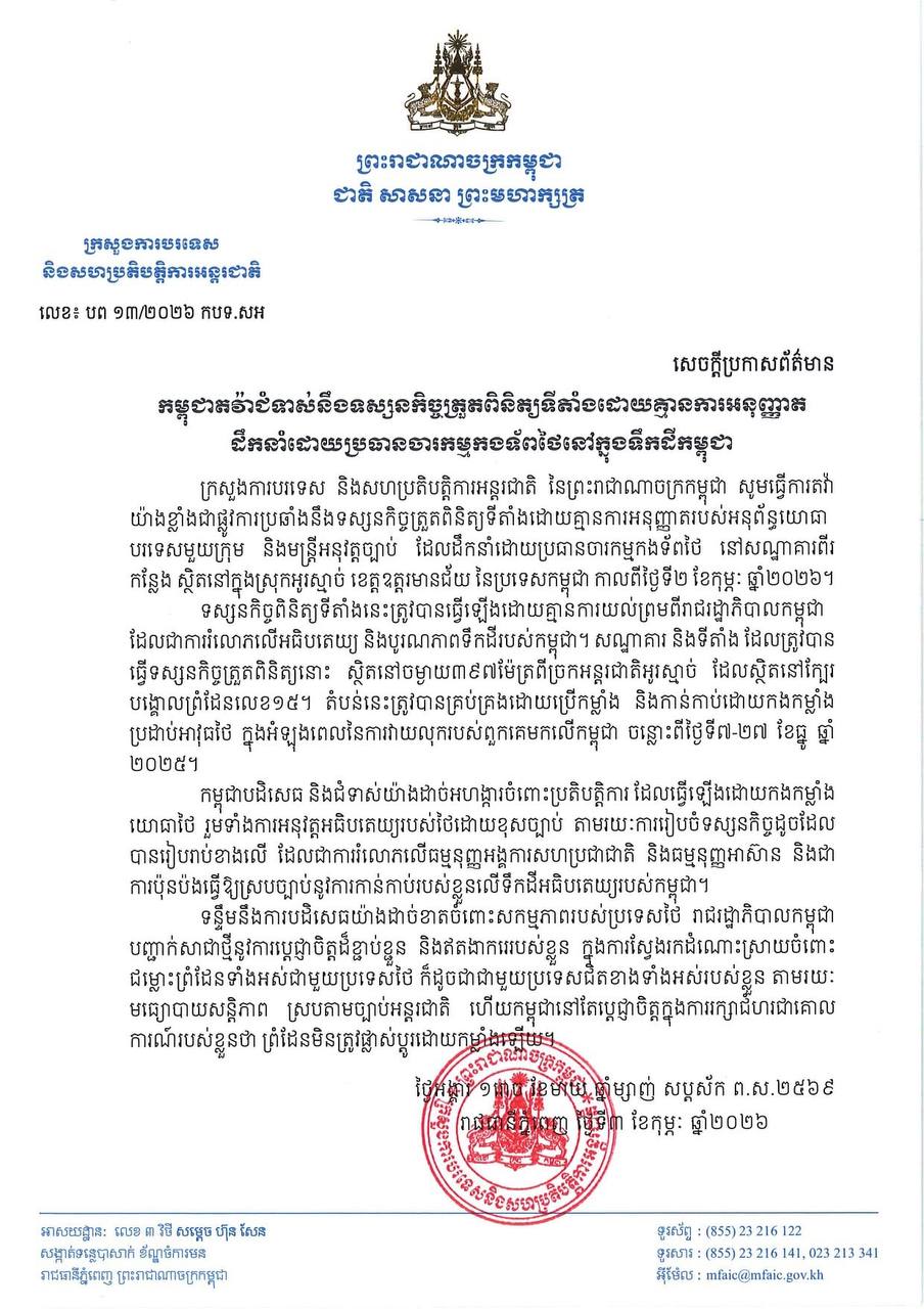 ភ្នំពេញ​៖​ ក្រសួងការបរទេស និងសហប្រតិបត្តិការអន្តរជាតិ នៃព្រះរាជាណាចក្រកម្ពុជា សូមធ្វើការតវ៉ា យ៉ាងខ្លាំងជាផ្លូវការប្រឆាំងនឹងទស្សនកិច្ចត្រួតពិនិត្យទីតាំងដោយគ្មានការអនុញ្ញាតរបស់អនុព័ន្ធយោធា បរទេសមួយក្រុម និងមន្ត្រីអនុវត្តច្បាប់ ដែលដឹកនាំដោយប្រធានចារកម្មកងទ័ពថៃ នៅសណ្ឋាគារពីរ កន្លែង ស្ថិតនៅក្នុងស្រុកអូរស្មាច់ ខេត្តឧត្តរមានជ័យ នៃប្រទេសកម្ពុជា កាលពីថ្ងៃទី២ ខែកុម្ភៈ ឆ្នាំ២០២៦។