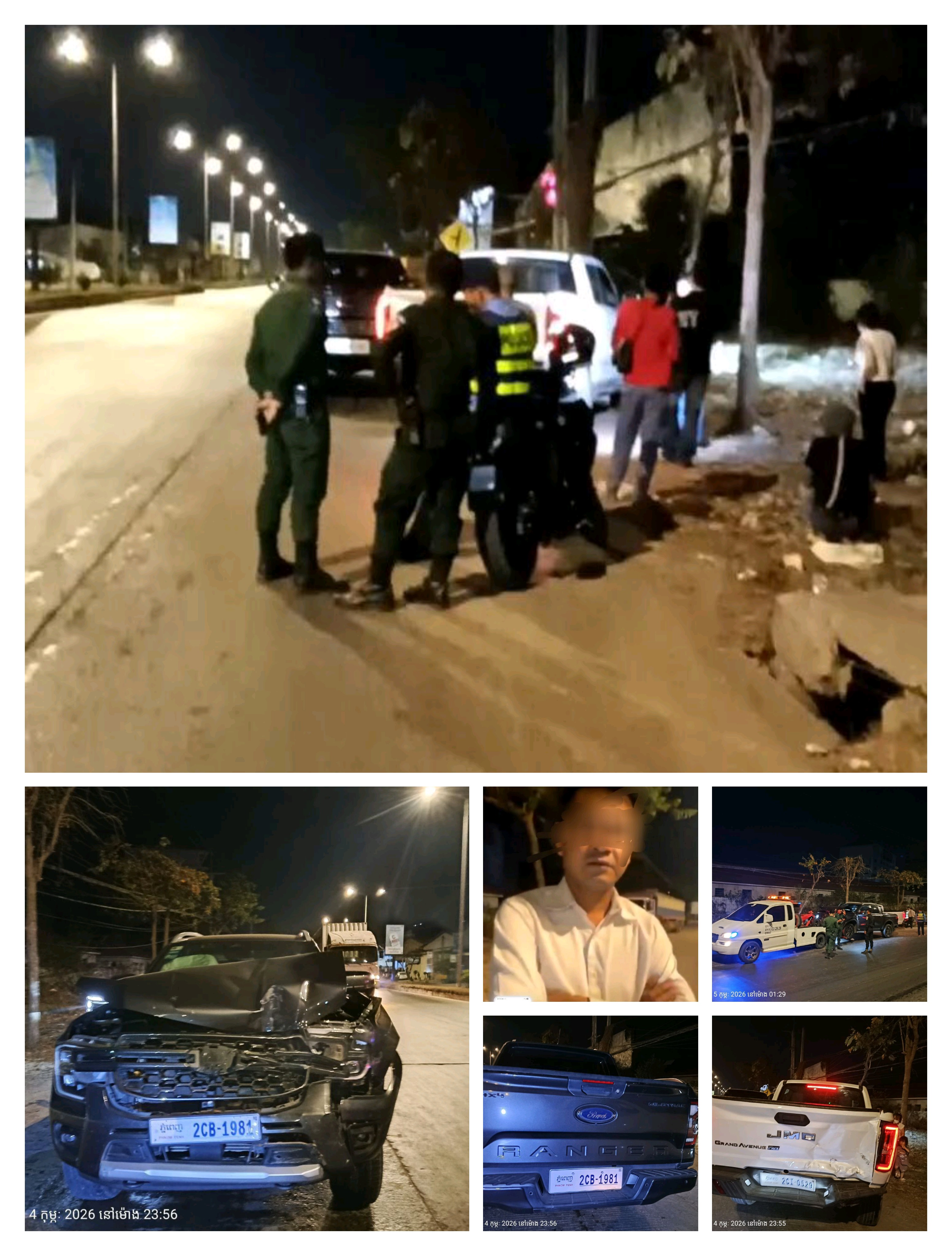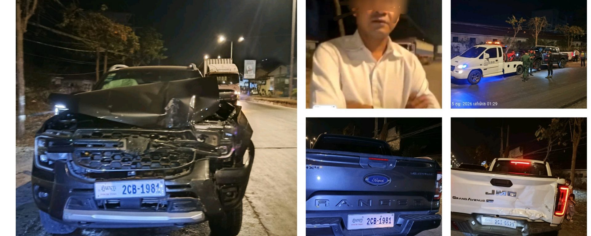 ភ្នំពេញ÷ បុរសម្នាក់បើករថយន្ត Ford មួយគ្រឿងពាក់ស្លាកលេខភ្នំពេញ2CB-1981សង្ស័យក្នុងស្ថានភាពស្រវឹងបានជ្រុលទៅបុករថយន្តJMCមួយគ្រឿងពាក់ស្លាកលេខភ្នំពេញ2CI-0529 ពីក្រោយយ៉ាងពេញទំហឹងបណ្តាលឲ្យរថយន្តទាំងពីររងការខូចខាតយ៉ាងដំណំ។