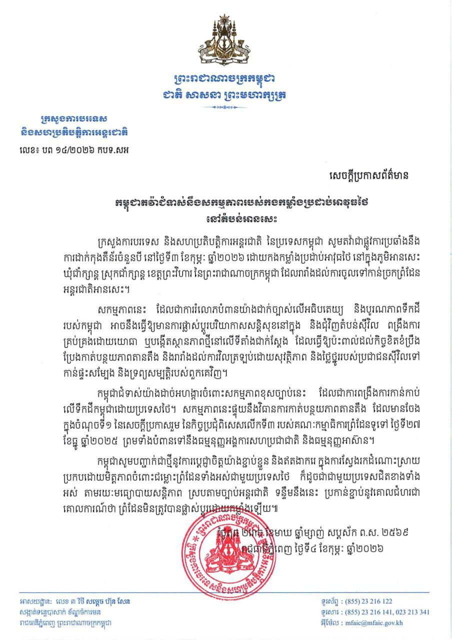 ភ្នំពេញ៖ ក្រសួងការបរទេស និងសហប្រតិបត្តិការអន្តរជាតិ នៃប្រទេសកម្ពុជា សូមតវ៉ាជាផ្លូវការប្រឆាំងនឹង ការដាក់កុងតឺន័រចំនួនបី នៅថ្ងៃទី៣ ខែកុម្ភៈ ឆ្នាំ២០២៦ ដោយកងកម្លាំងប្រដាប់អាវុធថៃ នៅក្នុងភូមិអានសេះ ឃុំជាំក្សាន្ត ស្រុកជាំក្សាន្ត ខេត្តព្រះវិហារ នៃព្រះរាជាណាចក្រកម្ពុជា ដែលរារាំងដល់ការចូលទៅកាន់ច្រកព្រំដែន អន្តរជាតិអានសេះ។