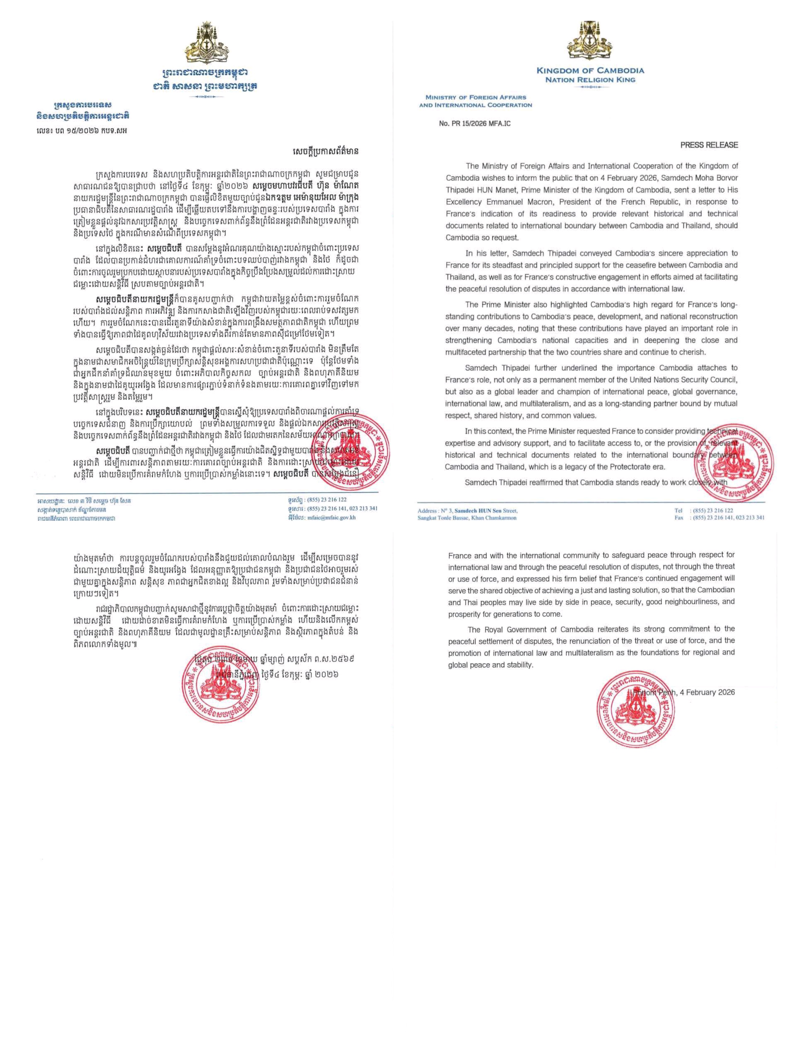 ភ្នំពេញ : ក្រសួងការបរទេស និងសហប្រតិបត្តិការអន្តរជាតិនៃព្រះរាជាណាចក្រកម្ពុជា សូមជម្រាបជូន សាធារណជនឱ្យបានជ្រាបថា នៅថ្ងៃទី៤ ខែកុម្ភៈ ឆ្នាំ២០២៦ សម្តេចមហាបវរធីបតី ហ៊ុន ម៉ាណែត នាយករដ្ឋមន្ត្រីនៃព្រះរាជាណាចក្រកម្ពុជា បានផ្ញើលិខិតមួយច្បាប់ជូនឯកឧត្តម អេម៉ានុយអែល ម៉ាក្រុង ប្រធានាធិបតីនៃសាធារណរដ្ឋបារាំង ដើម្បីឆ្លើយតបទៅនឹងការបង្ហាញឆន្ទៈរបស់ប្រទេសបារាំង ក្នុងការ ត្រៀមខ្លួនផ្តល់នូវឯកសារប្រវត្តិសាស្ត្រ និងបច្ចេកទេសពាក់ព័ន្ធនឹងព្រំដែនអន្តរជាតិរវាងប្រទេសកម្ពុជា និងប្រទេសថៃ ក្នុងករណីមានសំណើពីប្រទេសកម្ពុជា។