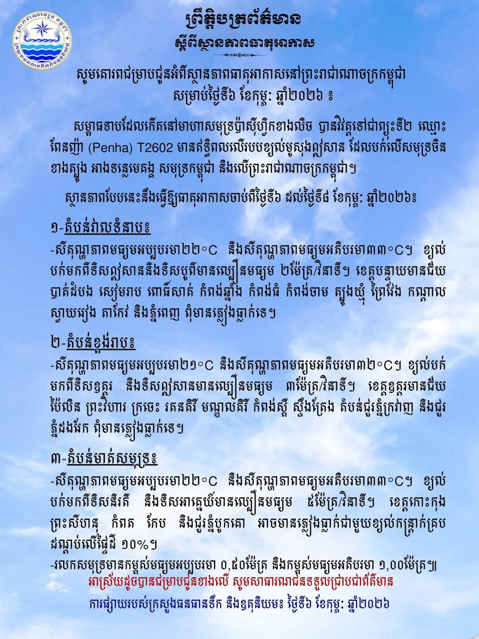 ភ្នំពេញ​៖​ ក្រសួងធនធានទឹក​ និង​ឧតុនិយម​ នៅព្រឹក​ថ្ងៃ​ទី​០៦​ ខែកុម្ភៈ​ ឆ្នាំ​២០២៦នេះ​ បានចេញសេចក្ដីជូនដំណឹង​ស្តីពីស្ថានភាពធាតុអាកាសនៅព្រះរាជាណាចក្រកម្ពុជា ខណៈ​សម្ពាធទាបដែលកើតនៅមហាសមុទ្រប៉ាស៊ីហ្វិកខាងលិច បានវិវត្តទៅជាព្យុះទី២ ឈ្មោះ ពែនញ៉ា (Penha) T2602 មានឥទ្ធិពលលើរបបខ្យល់មូសុងឦសាន ដែលបក់លើសមុទ្រចិន ខាងត្បូង អាងទន្លេមេគង្គ សមុទ្រកម្ពុជា និងលើព្រះរាជាណាចក្រកម្ពុជា។