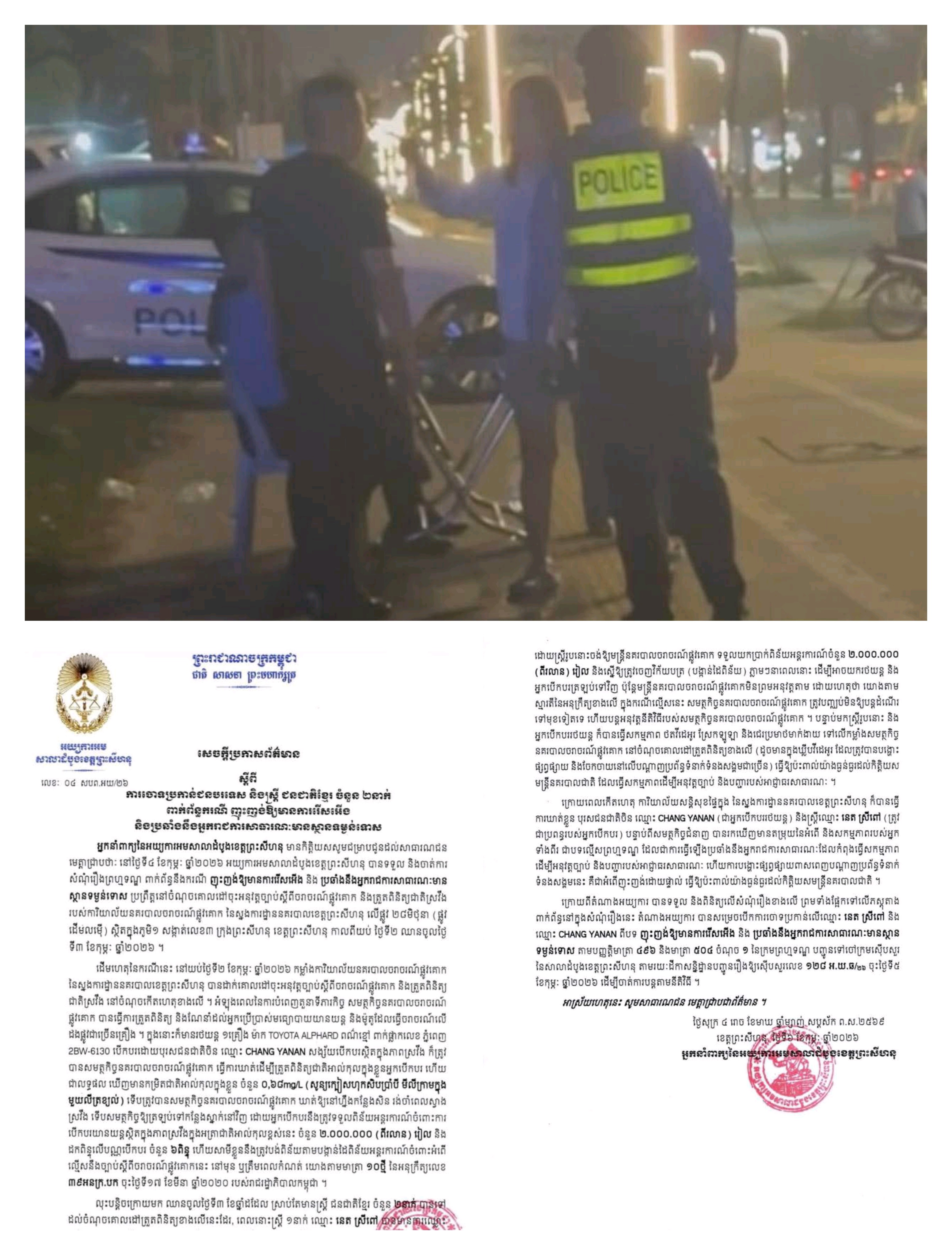 ដើមហេតុនៃករណីនេះ នៅយប់ថ្ងៃទី២ ខែកុម្ភៈ ឆ្នាំ២០២៦ កម្លាំងការិយាល័យនគរបាលចរាចរណ៍ផ្លូវគោក នៃស្នងការដ្ឋាននគរបាលខេត្តព្រះសីហនុ បានដាក់គោលដៅចុះអនុវត្តច្បាប់ស្តីពីចរាចរណ៍ផ្លូវគោក និងត្រួតពិនិត្យ ជាតិស្រវឹង នៅចំណុចកើតហេតុខាងលើ ។ អំឡុងពេលនៃការបំពេញតួនាទីភារកិច្ច សមត្ថកិច្ចនគរបាលចរាចរណ៍ ផ្លូវគោក បានធ្វើការត្រួតពិនិត្យ និងណែនាំដល់អ្នកប្រើប្រាស់មធ្យោបាយយានយន្ត និងម៉ូតូដែលធ្វើចរាចរណ៍លើ ដងផ្លូវជាច្រើនគ្រឿង ។ ក្នុងនោះក៏មានរថយន្ត ១គ្រឿង ម៉ាក TOYOTA ALPHARD ពណ៌ខ្មៅ ពាក់ផ្លាកលេខ ភ្នំពេញ 2BW-6130 បើកបរដោយបុរសជនជាតិចិន ឈ្មោះ CHANG YANAN សង្ស័យបើកបរស្ថិតក្នុងភាពស្រវឹង ក៏ត្រូវ បានសមត្ថកិច្ចនគរបាលចរាចរណ៍ផ្លូវគោក ធ្វើការឃាត់ដើម្បីត្រួតពិនិត្យជាតិអាល់កុលក្នុងខ្លួនអ្នកបើកបរ ហើយ ជាលទ្ធផល ឃើញមានកម្រិតជាតិអាល់កុលក្នុងខ្លួន ចំនួន ០,៦៨mg/L (សូន្យក្បៀសហុកសិបប្រាំបី មីលីក្រាមក្នុង មួយលីត្រខ្យល់) ទើបត្រូវបានសមត្ថកិច្ចនគរបាលចរាចរណ៍ផ្លូវគោក ឃាត់ឱ្យនៅហ្នឹងកន្លែងសិន រង់ចាំពេលស្វាង ស្រវឹង ទើបសមត្ថកិច្ចឱ្យត្រឡប់ទៅកន្លែងស្នាក់នៅវិញ ដោយអ្នកបើកបរនឹងត្រូវទទួលពិន័យអន្តរការណ៍ចំពោះការ បើកបរយានយន្តស្ថិតក្នុងភាពស្រវឹងក្នុងអត្រាជាតិអាល់កុលខ្ពស់នេះ ចំនួន ២.០០០.០០០ (ពីរលាន) រៀល និង ដកពិន្ទុលើបណ្ណបើកបរ ចំនួន ៦ពិន្ទុ ហើយសាមីខ្លួននឹងត្រូវបង់ពិន័យតាមបង្កាន់ដៃពិន័យអន្តរការណ៍ចំពោះអំពើ ល្មើសនឹងច្បាប់ស្តីពីចរាចរណ៍ផ្លូវគោកនេះ នៅមុន ឬត្រឹមពេលកំណត់ យោងតាមមាត្រា ១០ថ្មី នៃអនុក្រឹត្យលេខ ៣៩អនក្រ.បក ចុះថ្ងៃទី១៧ ខែមីនា ឆ្នាំ២០២០ របស់រាជរដ្ឋាភិបាលកម្ពុជា ។
