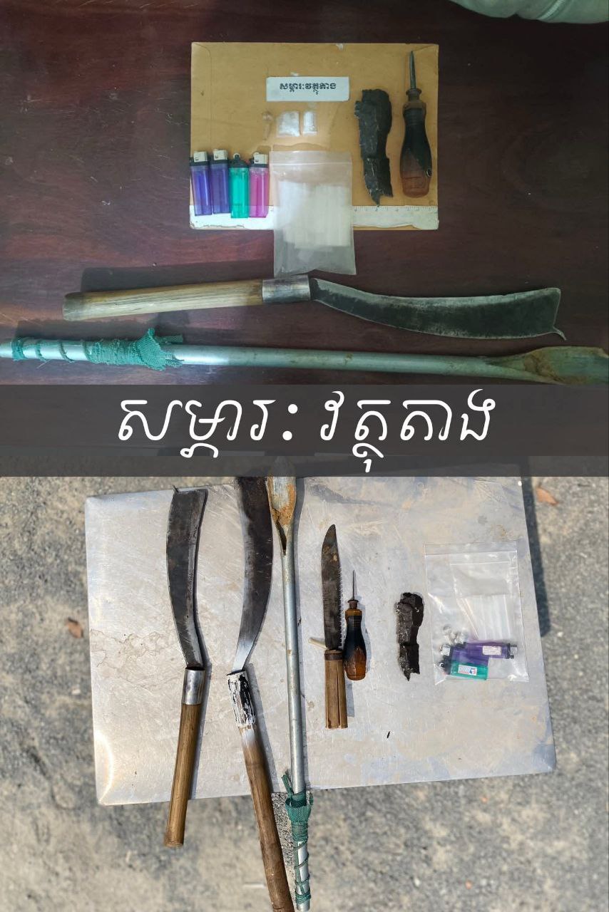 ជាក់ស្តែងកំលាំងមានសមត្ថកិច្ចបានឃាត់និងត្រួត ពិនិត្យឆែកឆេរ រកឃើញម្សៅក្រាមពណ៌សសង្ស័យជាគ្រឿងញៀនចំនួន២ កញ្ចប់តូច,កាំបិតផ្គាក់២ ដើម, កូនកាំបិតស្រួច០១ដើម,ចបជីក ០១ ដើម,ទុលវីសចុងស្រួច ០១ ដើម.ដែកបំណែក ០១ ដុំ និង ឧបករណ៍កែឆ្នៃសម្រាប់ប្រើប្រាស់គ្រឿងញៀនមួយចំនួន ។