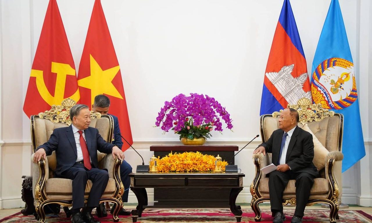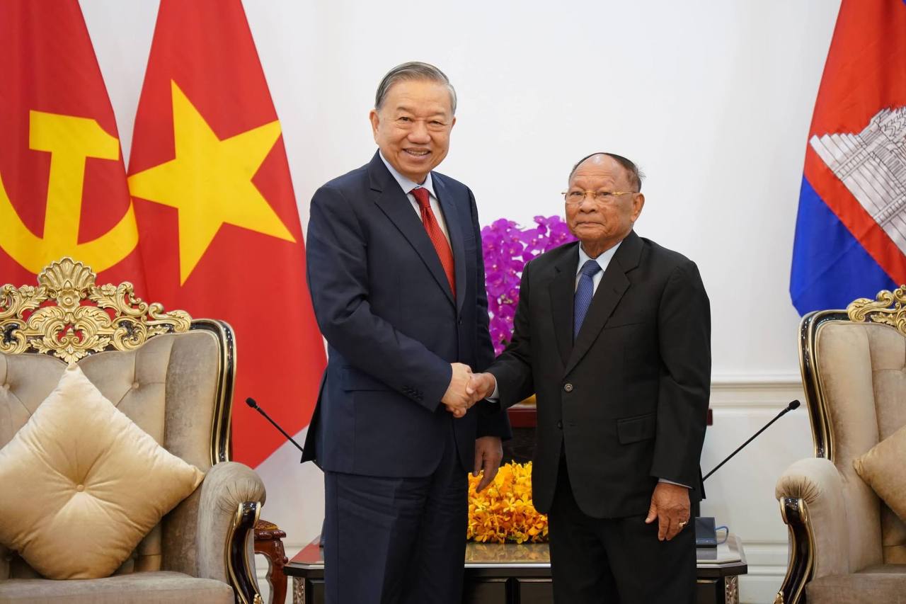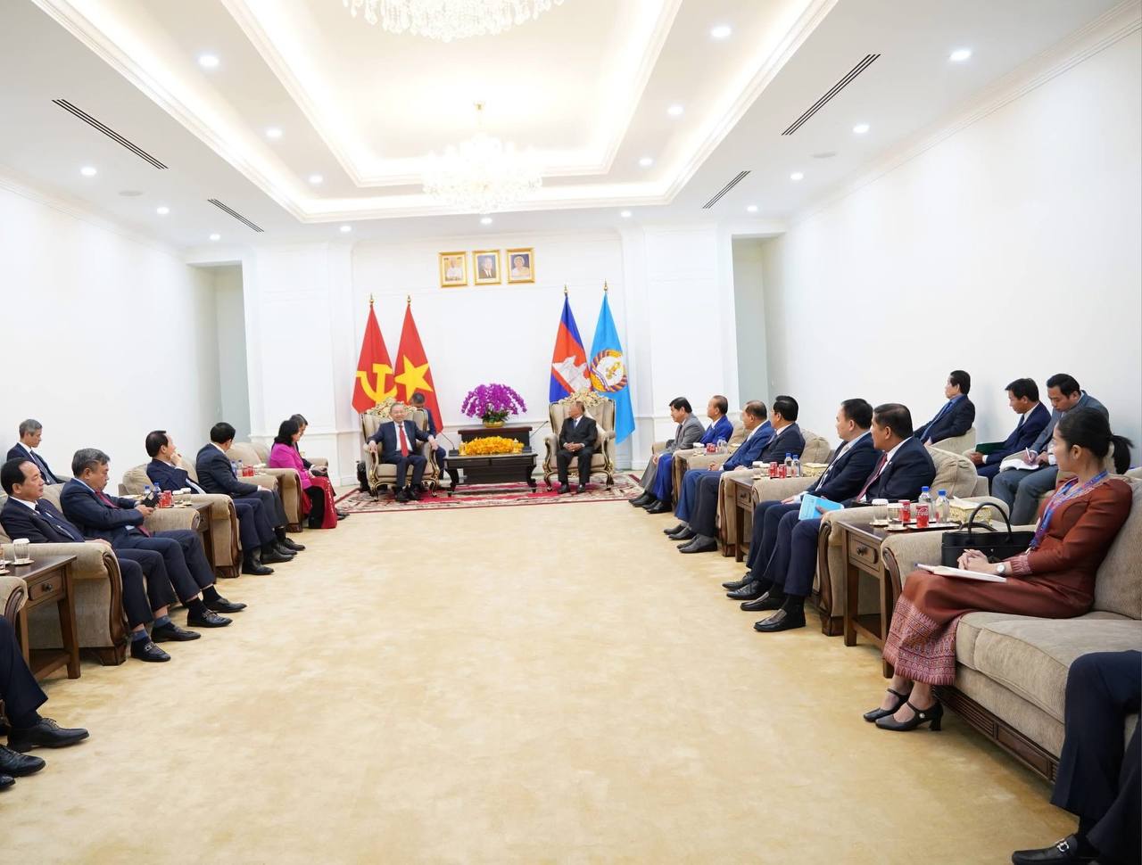 ភ្នំពេញ ៖ សម្តេចអគ្គមហាពញាចក្រី ហេង សំរិន ប្រធានកិត្តិយសនៃក្រុមឧត្តមប្រឹក្សាផ្ទាល់ព្រះមហាក្សត្រ នារសៀលថ្ងៃទី៦ ខែកុម្ភៈ ឆ្នាំ២០២៦ បានទទួលជួបសំណេះសំណាល និងពិភាក្សាការងារជាមួយ លោក តូ ឡឹម អគ្គលេខាធិការនៃគណៈកម្មាធិការមជ្ឈិមបក្សកុម្មុយនីស្តវៀតណាម នៅវិមាន៧មករា ។