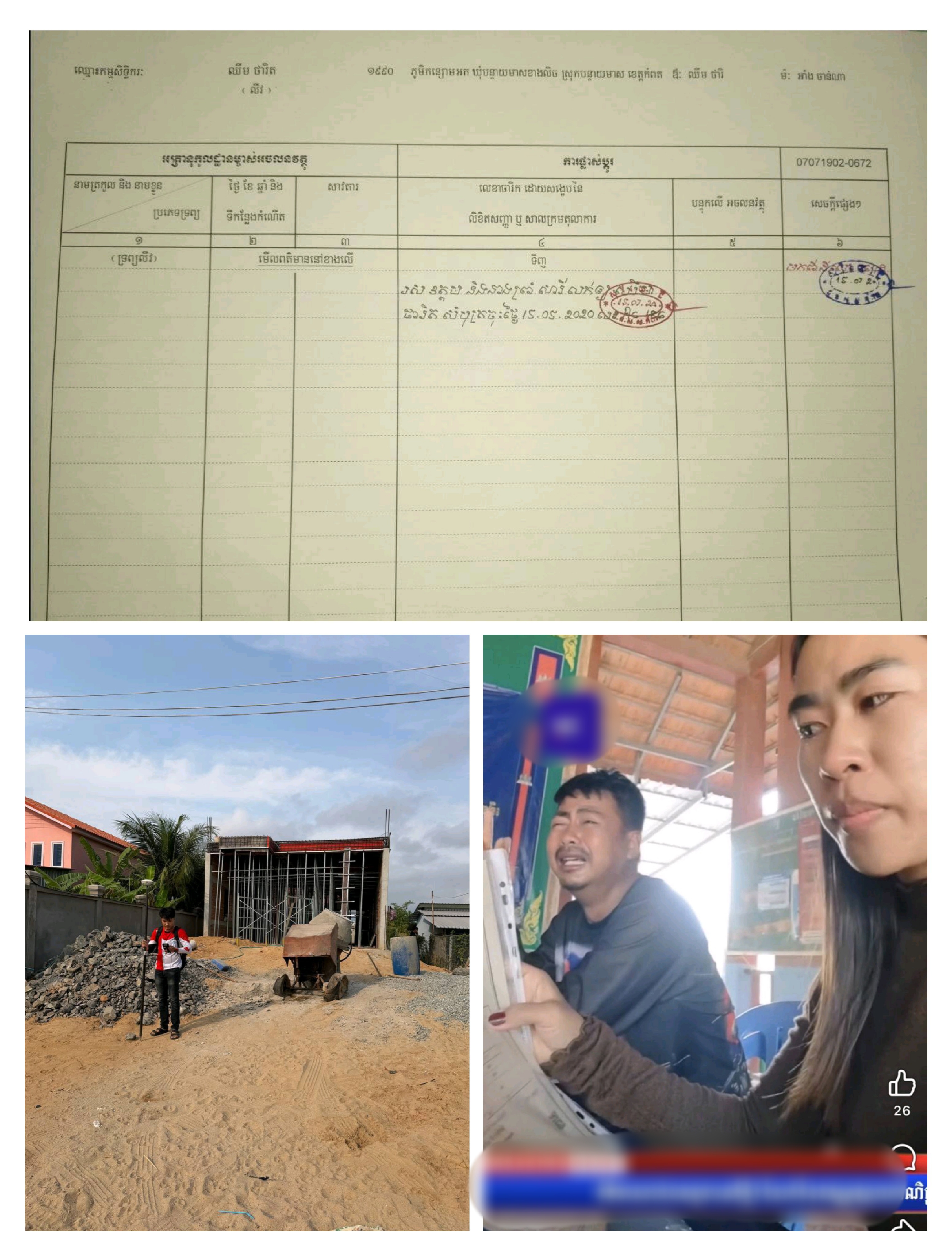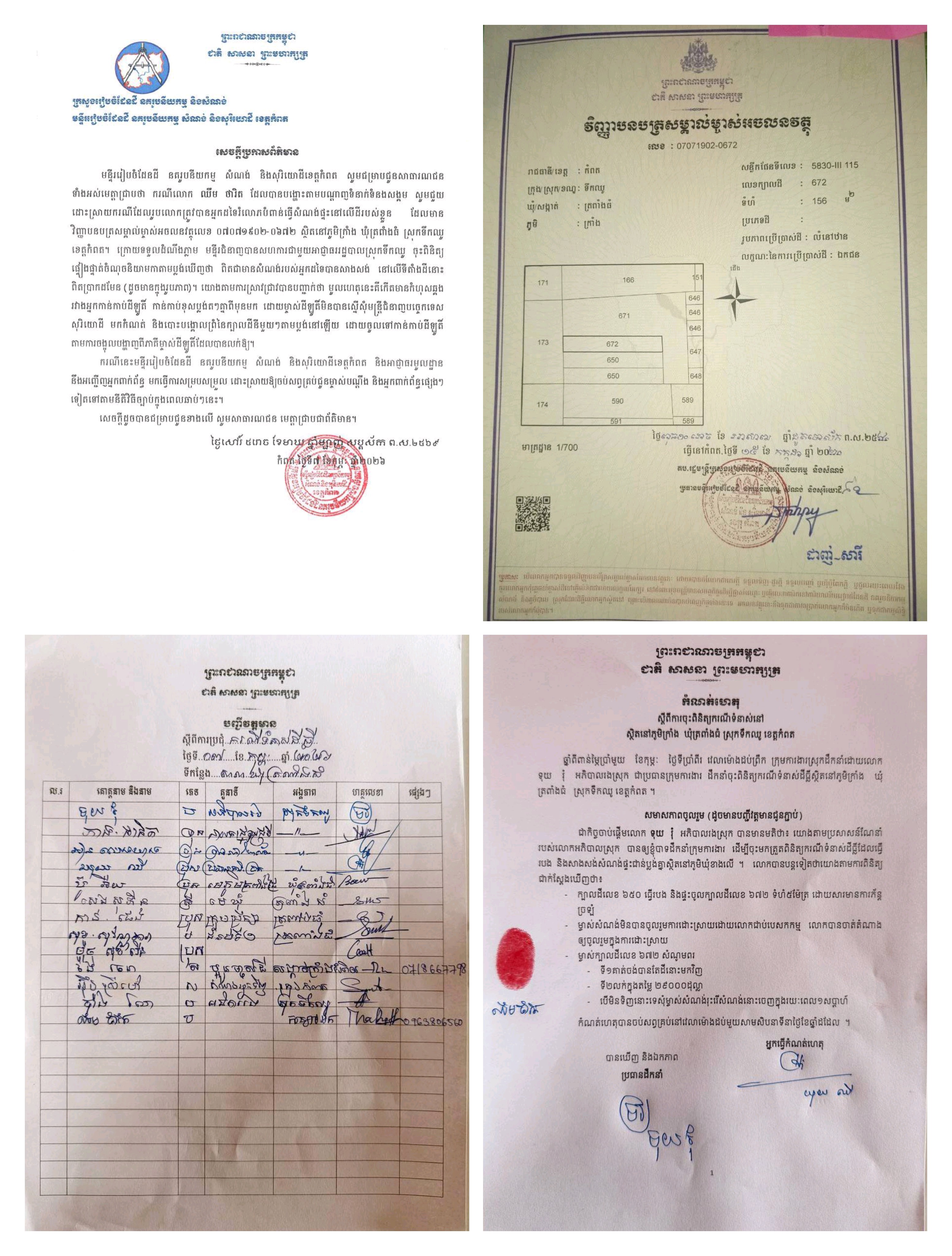 ក្នុងសេចក្ដីប្រកាសព័ត៌មានរបស់មន្ទីររៀបចំដែនដីខេត្តកំពត នៅថ្ងៃទី៧ ខែកុម្ភៈ ឆ្នាំ២០២៦នេះ បានបញ្ជាក់ថា ក្រោយទទួលដំណឹងភ្លាម មន្ទីរជំនាញបានសហការជាមួយអាជ្ញាធររដ្ឋបាលស្រុកទឹកឈូ ចុះពិនិត្យផ្ទៀងផ្ទាត់ចំណុចនិយាមកាតាមប្លង់ឃើញថា ពិតជាមានសំណង់របស់អ្នកដទៃបានសាងសង់ នៅលើទីតាំងដីនោះពិតប្រាកដមែន (ដូចមានក្នុងរូបភាព)។