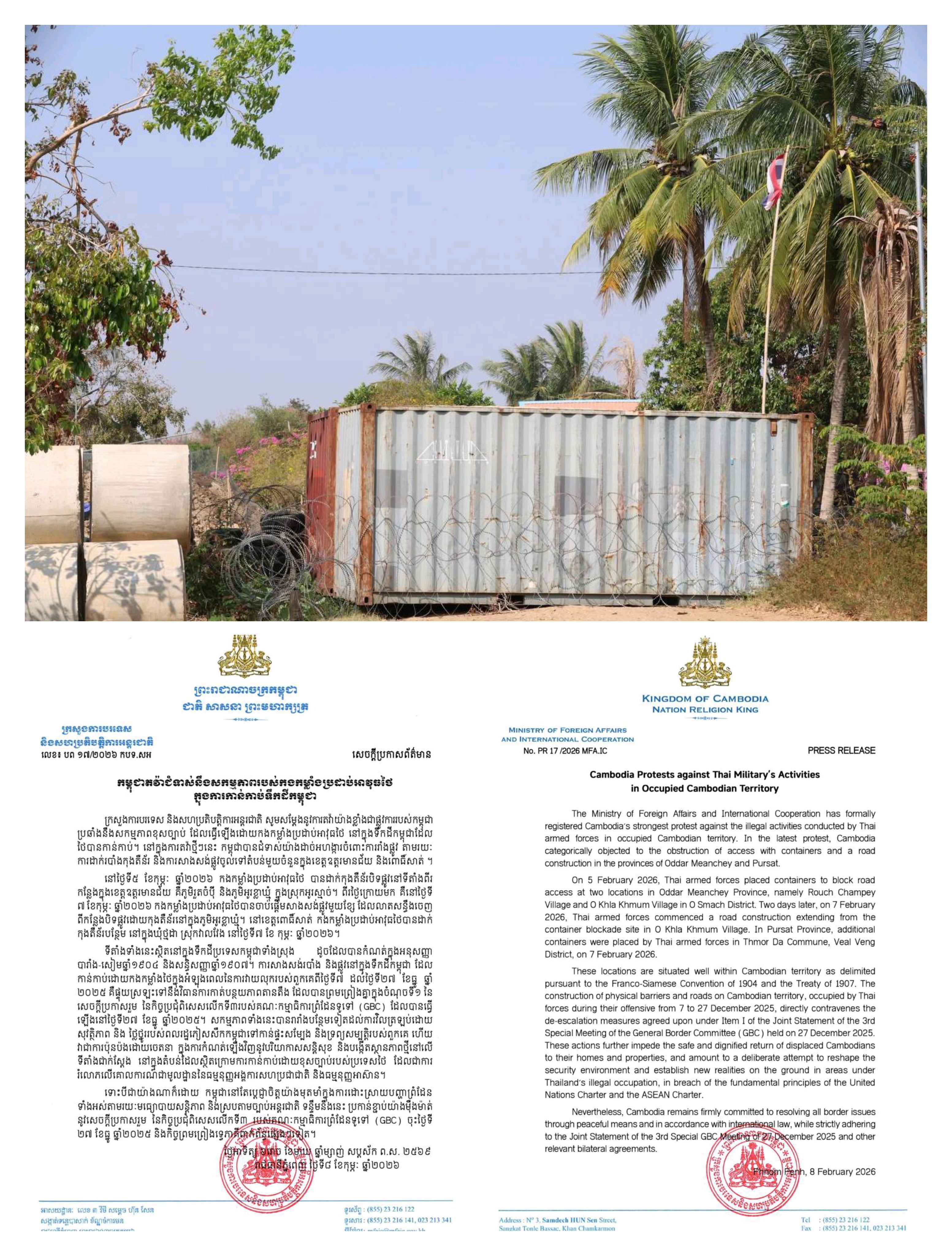 ព្រំដែនកម្ពុជា-ថៃ៖ ក្រសួងការបរទេស និងសហប្រតិបត្តិការអន្តរជាតិ នៅថ្ងៃអាទិត្យទី០៨ ខែកុម្ភៈ ឆ្នាំ២០២៨នេះ សូមសម្តែងនូវការតវ៉ាយ៉ាងខ្លាំងជាផ្លូវការរបស់កម្ពុជា ប្រឆាំងនឹងសកម្មភាពខុសច្បាប់ ដែលធ្វើឡើងដោយកងកម្លាំងប្រដាប់អាវុធថៃ នៅក្នុងទឹកដីកម្ពុជាដែល ថៃបានកាន់កាប់។ នៅក្នុងការតវ៉ាថ្មីៗនេះ កម្ពុជាបានជំទាស់យ៉ាងដាច់អហង្ការចំពោះការរាំងផ្លូវ តាមរយៈ ការដាក់របាំងកុងតឺន័រ និងការសាងសង់ផ្លូវចូលទៅតំបន់មួយចំនួនក្នុងខេត្តឧត្តរមានជ័យ និងពោធិ៍សាត់ ។
