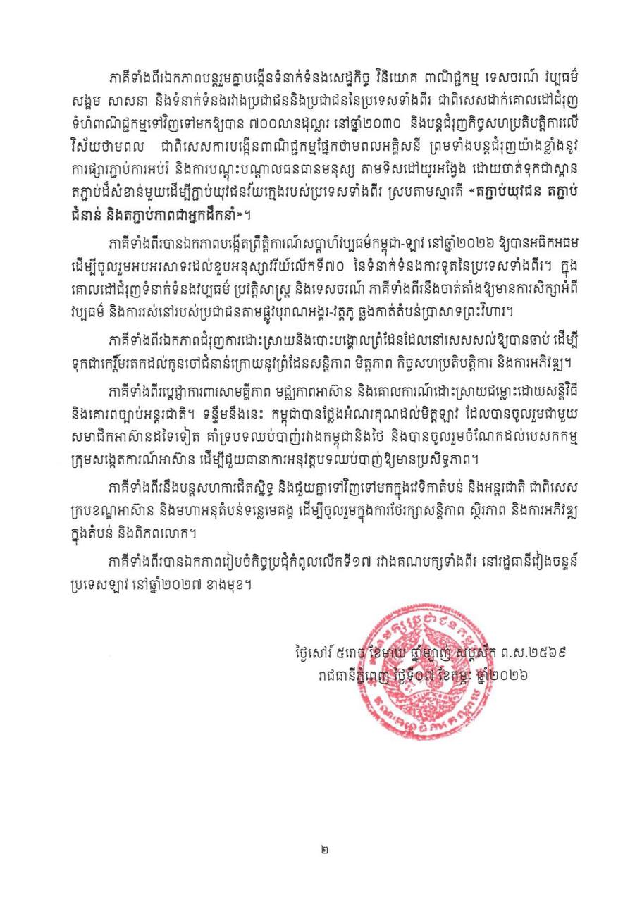 ភាគីទាំងពីរបានឯកភាពរៀបចំកិច្ចប្រជុំកំពូលលើកទី១៧ រវាងគណបក្សទាំងពីរ នៅរដ្ឋធានីវៀងចន្ទន៍ ប្រទេសឡាវ នៅឆ្នាំ២០២៧ ខាងមុខ៕