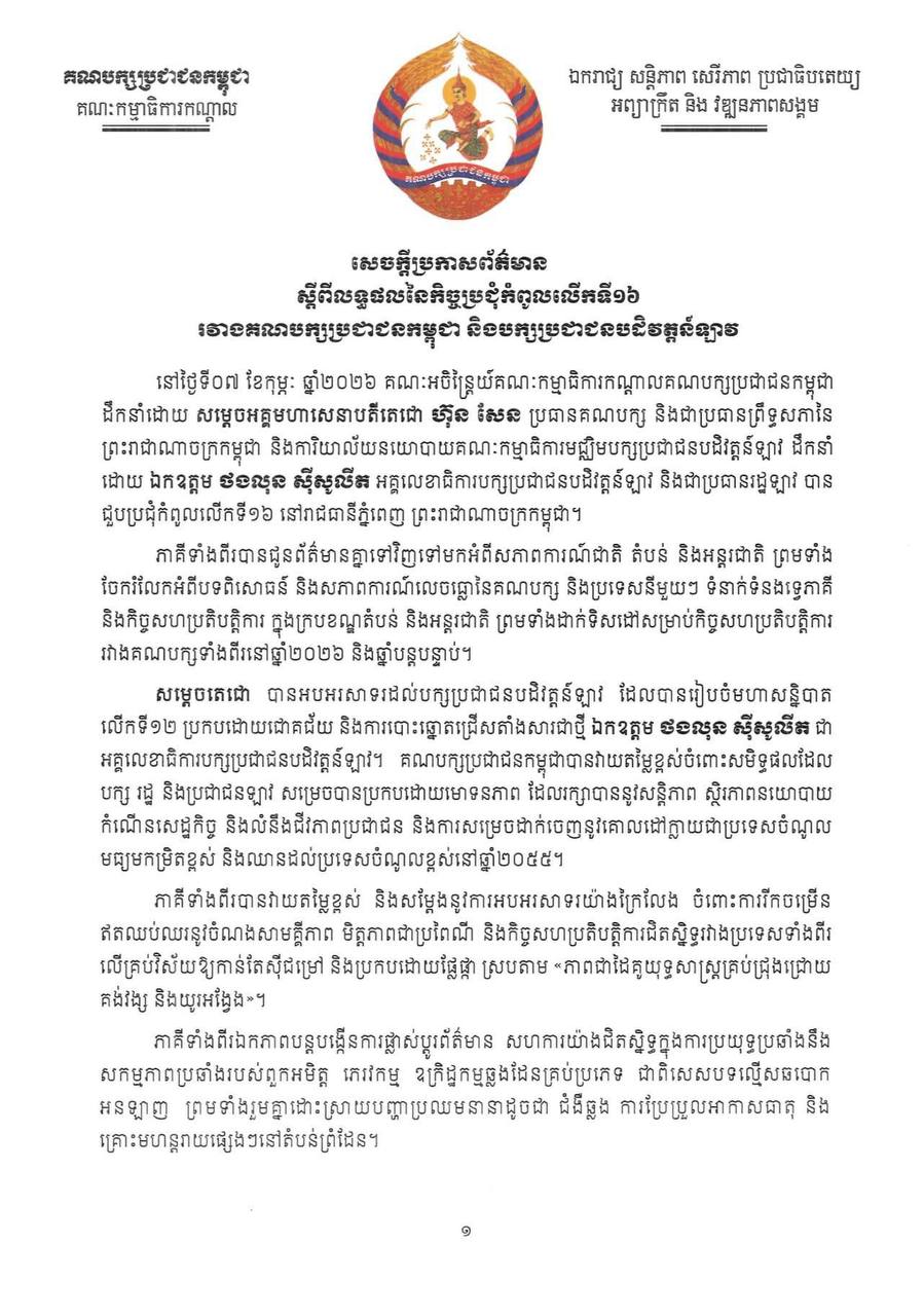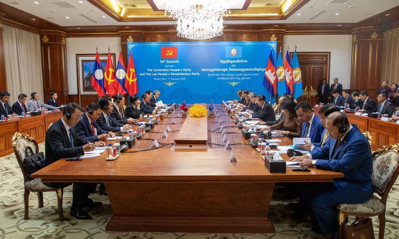 ភ្នំពេញ៖ គណៈអចិន្ត្រៃយ៍គណៈកម្មាធិការកណ្តាលគណបក្សប្រជាជនកម្ពុជា នៅថ្ងៃទី០៧ ខែកុម្ភៈ ឆ្នាំ២០២៦ ដឹកនាំដោយ សម្តេចអគ្គមហាសេនាបតីតេជោ ហ៊ុន សែន ប្រធានគណបក្ស និងជាប្រធានព្រឹទ្ធសភានៃ ព្រះរាជាណាចក្រកម្ពុជា និងការិយាល័យនយោបាយគណៈកម្មាធិការមជ្ឈិមបក្សប្រជាជនបដិវត្តន៍ឡាវ ដឹកនាំ ដោយ ឯកឧត្តម ថងលូន ស៊ីសូលីត អគ្គលេខាធិការបក្សប្រជាជនបដិវត្តន៍ឡាវ និងជាប្រធានរដ្ឋឡាវ បានជួបប្រជុំកំពូលលើកទី១៦ នៅរាជធានីភ្នំពេញ ព្រះរាជាណាចក្រកម្ពុជា។
