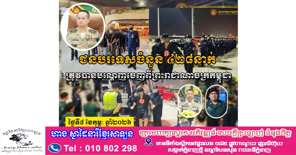 ប្រភពដដែលបន្តថា​ ជាក់ស្ដែង​នៅថ្ងៃទី៨ ខែកុម្ភៈ ឆ្នាំ២០២៦ អនុវត្តតាម​អនុសាសន៍​​ដ៏ខ្ពង់ខ្ពស់ របស់​លោកអភិ​សន្តិ​បណ្ឌិត ឧបនាយករដ្ឋមន្ត្រី រដ្ឋមន្ត្រីក្រសួងមហាផ្ទៃ លោកសន្តិបណ្ឌិត និង​ថ្នាក់​ដឹកនាំ​ក្រសួងមហាផ្ទៃ លោកឧត្តមសេនីយ៍ឯក សុខ វាសនា អគ្គនាយក​អន្តោ​ប្រវេសន៍ បានណែនាំឱ្យនាយកដ្ឋានស៊ើបអង្កេត និង​អនុវត្ត​នីតិវិធី បន្តធ្វើ​ការ​បណ្តេញ​ជន​បរទេស​សរុបចំនួន ៤២៨នាក់ (ស្រី ២៦នាក់) មាន ១០សញ្ជាតិ រួមមាន លីន៊េរីយ៉ា នេប៉ាល់ ឥណ្ឌា  ប៉ាគីស្ថាន ចិន ហ្វីលីពីន ថៃ កូរ៉េ មីប៊ី និងឥណ្ឌូណេស៊ី ចេញ​ពី​ព្រះរាជាណា​ចក្រ​កម្ពុជា ក្នុងនោះមានជនជាតិចិនចំនួន ៣១២នាក់ ពាក់ព័ន្ធករណីឆបោកតាមប្រព័ន្ធបច្ចេកវិទ្យា (Online Scams) ត្រូវបានបណ្ដេញចេញតាមប៉ុស្តិ៍នគរបាលច្រកទ្វារអាកាសអន្តរជាតិតេជោ និងមួយចំនួនទៀតពាក់​ព័ន្ធករណីលួចឆ្លងដែន ស្នាក់នៅធ្វើ​ការងារ​ខុស​ច្បាប់ក្នុងព្រះរាជាណាចក្រកម្ពុជា៕ដោយ​៖តារា​
