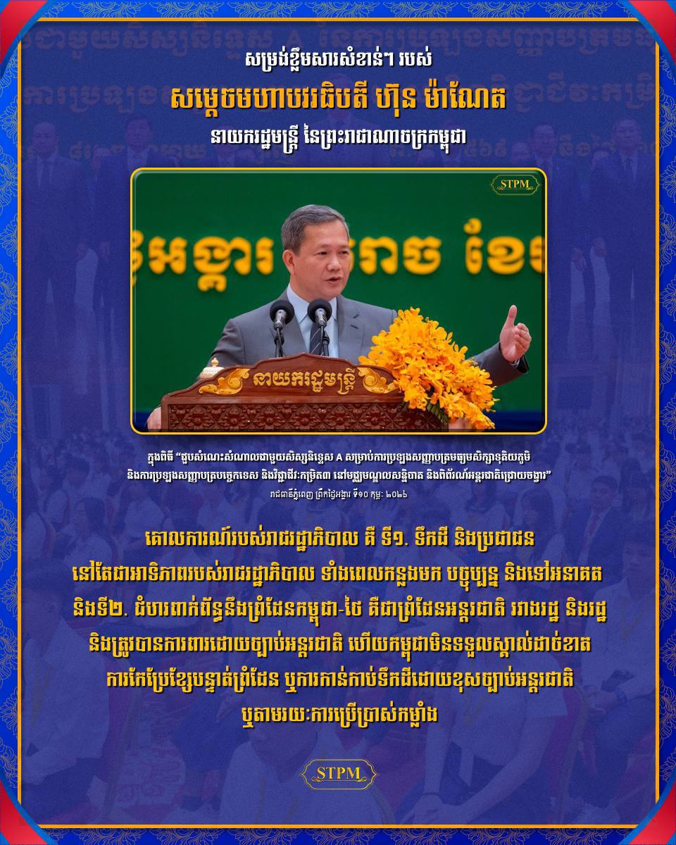 សម្តេចមហាបវរធិបតី ហ៊ុន ម៉ាណែត នាយករដ្ឋមន្រ្តី នៃព្រះរាជាណាចក្រកម្ពុជា បានថ្លែងក្នុងពិធីសំណេះសំណាលជាមួយសិស្សជាប់និទ្ទេស A សម្រាប់ការប្រឡងសញ្ញាបត្រមធ្យមសិក្សាទុតិយភូមិ និង ការប្រឡងសញ្ញាបត្របច្ចេកទេស និង វិជ្ជាជីវៈ កម្រិត៣ នៅព្រឹកថ្ងៃទី ១០ ខែ កុម្ភៈ ឆ្នាំ ២០២៦ ថា គោលការណ៍របស់រាជរដ្ឋាភិបាល គឺ ទី១. ទឹកដី និងប្រជាជន នៅតែជាអាទិភាពរបស់រាជរដ្ឋាភិបាល ទាំងពេលកន្លងមក បច្ចុប្បន្ន និងទៅអនាគត និង ទី២. ជំហរពាក់ព័ន្ធនឹងព្រំដែនកម្ពុជា-ថៃ គឺជាព្រំដែនអន្តរជាតិ រវាងរដ្ឋ និងរដ្ឋ និងត្រូវបានការពារដោយច្បាប់អន្តរជាតិ ជាពិសេសធម្មនុញ្ញរបស់អង្គការសហប្រជាជាតិ។ ហេតុដូចនេះ, កម្ពុជាប្រកាន់ជំហរដាច់ខាត ក្នុងការការពារអធិបតេយ្យជាតិ និងបូរណភាពទឹកដី ទាំងបច្ចុប្បន្ន ទាំងទៅអនាគត ដោយប្រើប្រាស់គ្រប់មធ្យោបាយដែលកម្ពុជាមាន ស្របតាមច្បាប់អន្តរជាតិ ហើយកម្ពុជាមិនទទួលស្គាល់ដាច់ខាតការកែប្រែខ្សែបន្ទាត់ព្រំដែន ឬការកាន់កាប់ទឹកដីដោយខុសច្បាប់អន្តរជាតិ ឬ តាមរយៈការប្រើប្រាស់កម្លាំង។ បន្ថែមពីនេះ, កម្ពុជាប្រកាន់ខ្ជាប់នូវការដោះស្រាយបញ្ហាព្រំដែនកម្ពុជា-ថៃ ដោយសន្តិវិធី ស្របតាមច្បាប់អន្តរជាតិ ព្រមទាំងកិច្ចព្រមព្រៀងដែលមានស្រាប់ដែលកម្ពុជា និងថៃ បានចុះហត្ថលេខាជាមួយគ្នា ជាពិសេសការចុះវាស់វែងតាមយន្ដការគណៈកម្មការចម្រុះ ខណ្ឌសីមាព្រំដែនគោក (JBC) ដើម្បីកំណត់ភាពត្រឹមត្រូវ និងយុត្តិធម៌របស់ប្រទេសទាំងពីរក្នុងការការពារអធិបតេយ្យភាព និងបូរណភាពទឹកដីរៀងៗខ្លួន ។