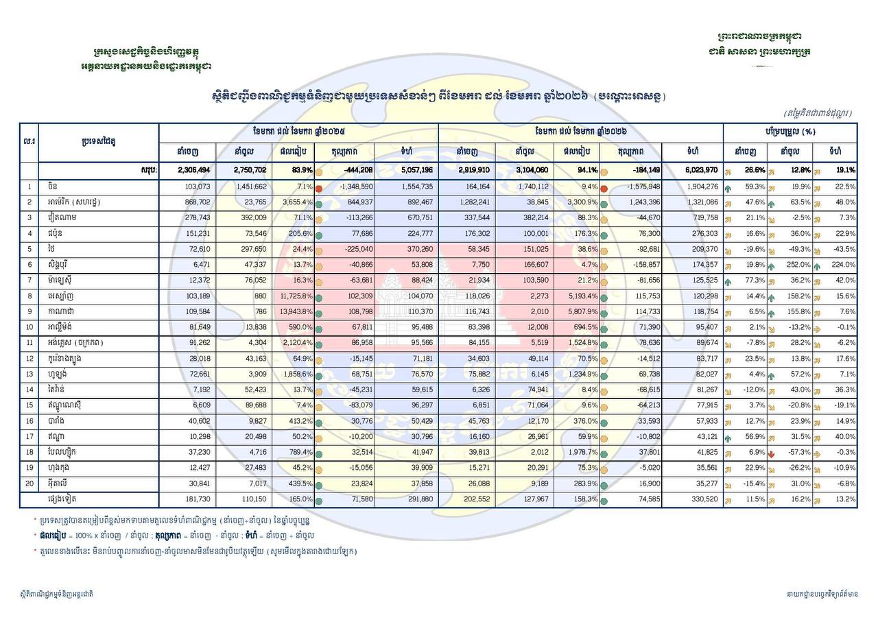 របាយការណ៍ដដែល បានបញ្ជាក់ថា ក្នុងខែមករា ឆ្នាំ២០២៦ កម្ពុជាបាននាំចេញទំនិញ ក្នុងតម្លៃជាង ២,៩១៩លានដុល្លារ កើនឡើង២៦.៦%។ ចំណែកការនាំចូលទំនិញមកវិញមានតម្លៃ ៣,១០៤លានដុល្លារ កើនឡើង១២.៨% បើធៀបនឹងរយៈពេលដូចគ្នា កាលឆ្នាំ២០២៥។