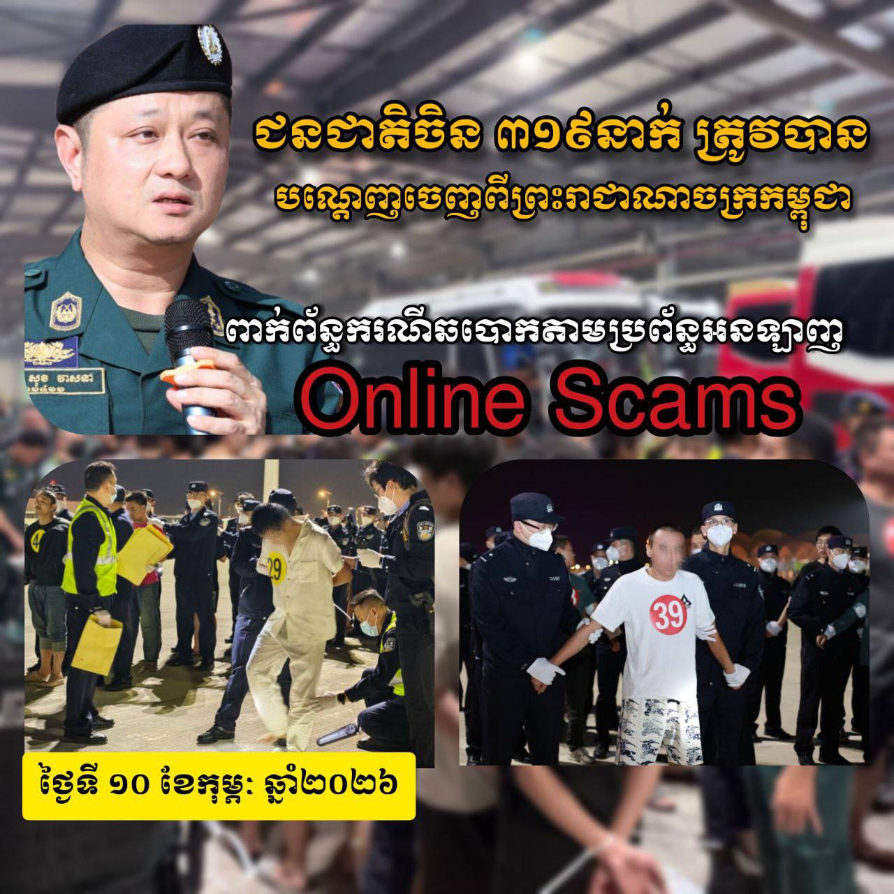 ភ្នំពេញ​៖​ អនុវត្តតាម​អនុសាសន៍​​របស់អភិ​សន្តិ​បណ្ឌិត ឧបនាយករដ្ឋមន្ត្រី រដ្ឋមន្ត្រីក្រសួងមហាផ្ទៃ លោកសន្តិបណ្ឌិត និង​ថ្នាក់​ដឹកនាំ​ក្រសួងមហាផ្ទៃ លោកឧត្តមសេនីយ៍ឯក សុខ វាសនា អគ្គនាយក​អន្តោ​ប្រវេសន៍ នៅថ្ងៃទី១០ ខែកុម្ភៈ ឆ្នាំ២០២៦ បានណែនាំឱ្យនាយកដ្ឋានស៊ើបអង្កេត និង​អនុវត្ត​នីតិវិធី សហាការជាមួយស្ថានទូតចិន បន្តធ្វើ​ការ​បណ្តេញ​ជន​ជាតិចិនសរុបចំនួន ៣១៩នាក់ (ស្រី០នាក់) ពាក់​ព័ន្ធករណីឆបោកតាមប្រព័ន្ធអនឡាញ (Online Scams) ត្រូវបានបណ្ដេញចេញ​តាមរយៈយន្តហោះពិសេស នៅប៉ុស្តិ៍នគរបាលច្រកទ្វារអាកាសអន្តរជាតិតេជោ។