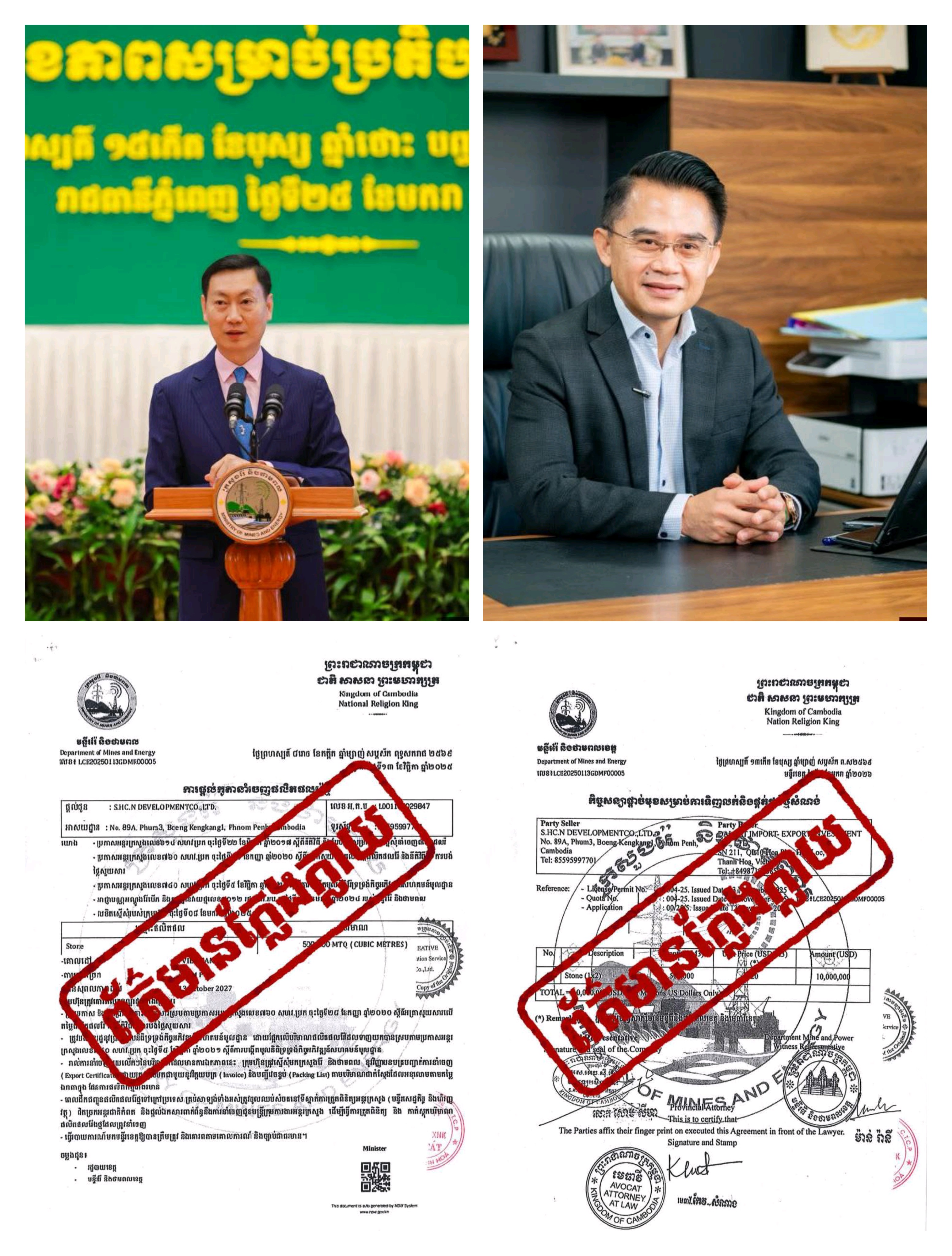 ភ្នំពេញ ៖ មន្ត្រីជាន់ខ្ពស់ក្រសួងរ៉ែ និងថាមពល នៅថ្ងៃទី១០ ខែកុម្ភៈ ឆ្នាំ២០២៦ បានចេញមកច្រានចោលលិខិតចំនួន ២សន្លឹក ពាក់ព័ន្ធនឹងការផ្តល់កូតានាំចេញផលិតផលរ៉ែថ្ម (ថ្មសំណង់សម្រាប់យកធ្វើផ្លូវជាដើម) ទៅក្រៅប្រទេស ដោយអះអាងថា ជាលិខិតក្លែងក្លាយ ដែលធ្វើឡើងដោយក្រុមឈ្មួញទុច្ចរិត សម្រាប់បោកប្រាស់ក្រុមអ្នកវិនិយោគតែប៉ុណ្ណោះ។