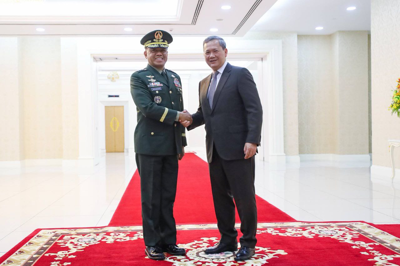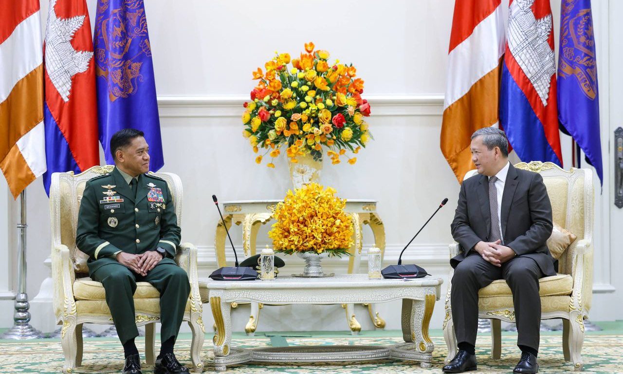 ភ្នំពេញ ៖ នាព្រឹកថ្ងៃទី១២ ខែកុម្ភៈ ឆ្នាំ២០២៦, សម្ដេចមហាបវរធិបតី ហ៊ុន ម៉ាណែត នាយករដ្ឋមន្ត្រី នៃព្រះរាជាណាចក្រកម្ពុជា បានអនុញ្ញាតឱ្យឯកឧត្តម នាយឧត្តមសេនីយ៍ Romeo S. Brawner Jr. អគ្គមេបញ្ជាការកងទ័ពហ្វីលីពីន ចូលជួបសម្ដែងការគួរសម និងពិភាក្សាការងារ នៅវិមានសន្ដិភាព។