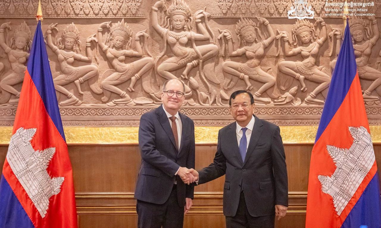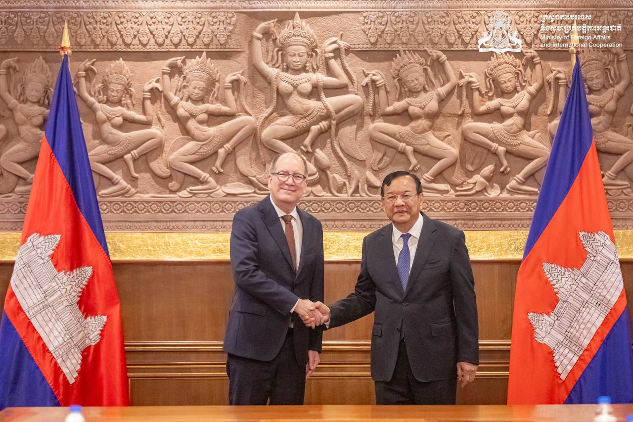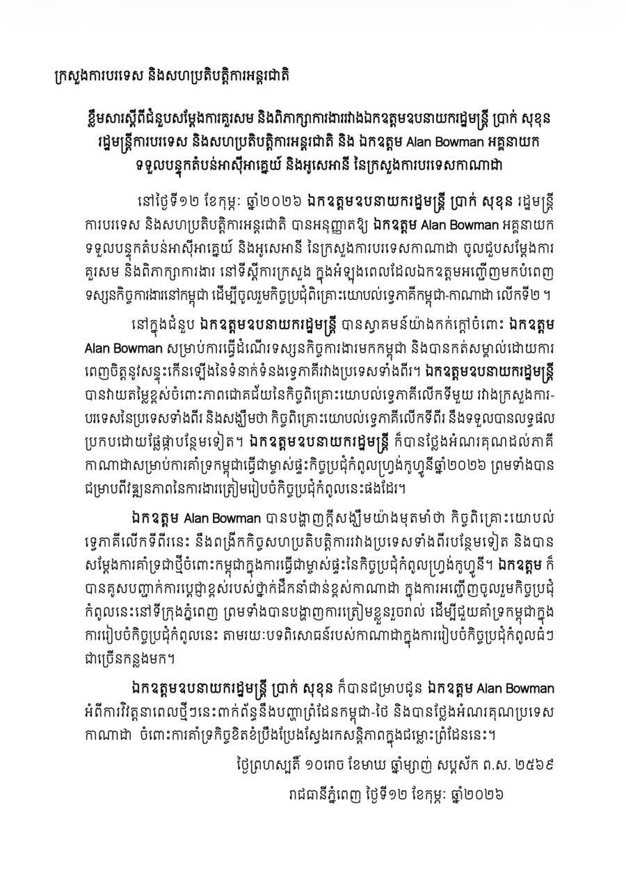 ភ្នំពេញ៖ លោកឧបនាយករដ្ឋមន្ត្រី ប្រាក់ សុខុន រដ្ឋមន្ត្រី ការបរទេស និងសហប្រតិបត្តិការអន្តរជាតិ នៅថ្ងៃទី១២ ខែកុម្ភៈ ឆ្នាំ២០២៦ បានអនុញ្ញាតឱ្យ លោក Alan Bowman អគ្គនាយក ទទួលបន្ទុកតំបន់អាស៊ីអាគ្នេយ៍ និងអូសេអានី នៃក្រសួងការបរទេសកាណាដា ចូលជួបសម្តែងការ គួរសម និងពិភាក្សាការងារ នៅទីស្តីការក្រសួង ក្នុងអំឡុងពេលដែលឯកឧត្តមអញ្ជើញមកបំពេញ ទស្សនកិច្ចការងារនៅកម្ពុជា ដើម្បីចូលរួមកិច្ចប្រជុំពិគ្រោះយោបល់ទ្វេភាគីកម្ពុជា-កាណាដា លើកទី២ ។