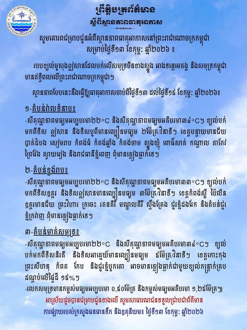 ភ្នំពេញ៖ ក្រសួងធនធានទឹក និងឧតុនិយម នៅព្រឹកថ្ងៃទី១៣ ខែកុម្ភៈ ឆ្នាំ២០២៦នេះ បានចេញសេចក្ដីជូនដំណឹងស្តីពីស្ថានភាពធាតុអាកាសនៅព្រះរាជាណាចក្រកម្ពុជា ខណៈរបបខ្យល់មូសុងឦសានដែលបក់លើសមុទ្រចិនខាងត្បូង អាងទន្លេមេគង្គ និងសមុទ្រកម្ពុជា មានឥទ្ធិពលលើព្រះរាជាណាចក្រកម្ពុជា។