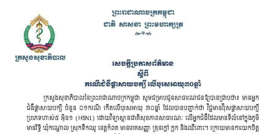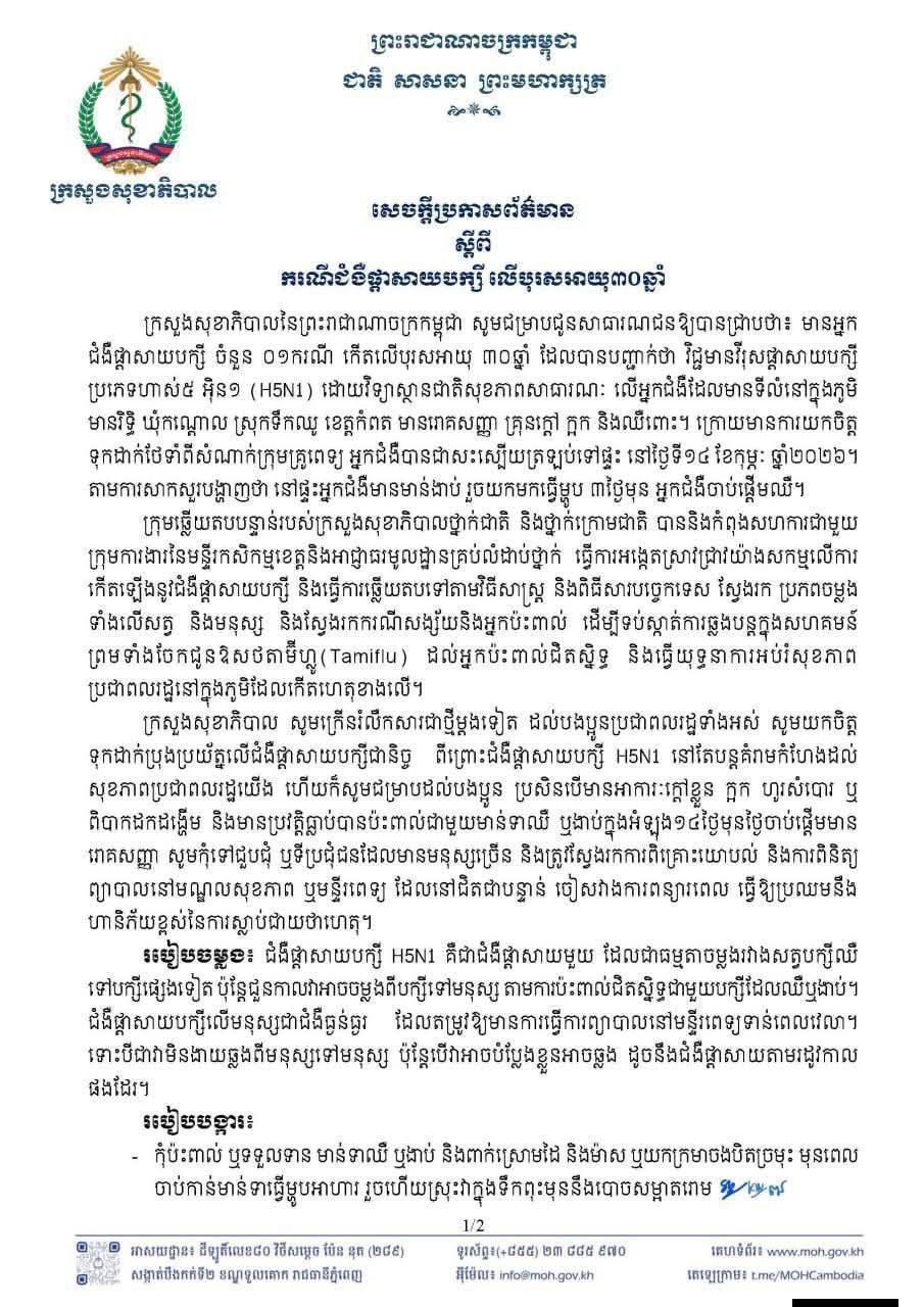 ភ្នំពេញ៖ ក្រសួងសុខាភិបាលនៃព្រះរាជាណាចក្រកម្ពុជា សូមជម្រាបជូនសាធារណជនឱ្យបានជ្រាបថា៖ មានអ្នក ជំងឺផ្តាសាយបក្សី ចំនួន ០១ករណី កើតលើបុរសអាយុ ៣០ឆ្នាំ ដែលបានបញ្ជាក់ថា វិជ្ជមានវីរុសផ្តាសាយបក្សី ប្រភេទហាស់៥ អ៊ុន១ (H5N1) ដោយវិទ្យាស្ថានជាតិសុខភាពសាធារណៈ លើអ្នកជំងឺដែលមានទីលំនៅក្នុងភូមិ មានរិទ្ធិ ឃុំកណ្តោល ស្រុកទឹកឈូ ខេត្តកំពត មានរោគសញ្ញា គ្រុនក្តៅ ក្អក និងឈឺពោះ។ ក្រោយមានការយកចិត្ត ទុកដាក់ថែទាំពីសំណាក់ក្រុមគ្រូពេទ្យ អ្នកជំងឺបានជាសះស្បើយត្រឡប់ទៅផ្ទះ នៅថ្ងៃទី១៤ ខែកុម្ភៈ ឆ្នាំ២០២៦។ តាមការសាកសួរបង្ហាញថា នៅផ្ទះអ្នកជំងឺមានមាន់ងាប់ រួចយកមកធ្វើម្ហូប ៣ថ្ងៃមុន អ្នកជំងឺចាប់ផ្តើមឈឺ។