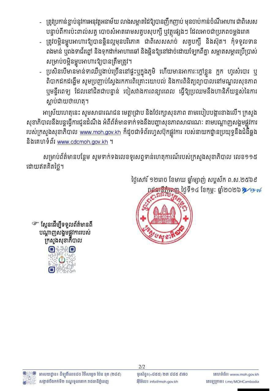 អាស្រ័យហេតុនេះ សូមសាធារណជន មេត្តាជ្រាប និងថែរក្សាសុខភាព តាមរបៀបបង្ការខាងលើ។ ក្រសួង សុខាភិបាលនឹងបន្តធ្វើការជូនដំណឹង អំពីព័ត៌មានទាក់ទងនឹងបញ្ហាសុខភាពសាធារណៈ តាមបណ្តាញសង្គមផ្លូវការ របស់ក្រសួងសុខាភិបាល www.moh.gov.kh ក៏ដូចជាទំព័រហ្វេសប៊ុកផ្លូវការ របស់នាយកដ្ឋានប្រយុទ្ធនឹងជំងឺឆ្លង និងគេហទំព័រ www.cdcmoh.gov.kh ។