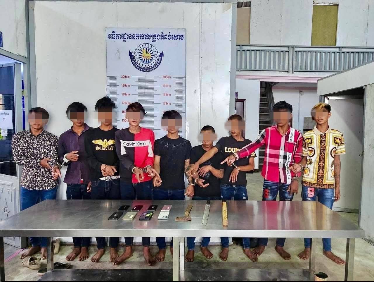 នគរបាលក្រុងកំពង់សោមបង្រ្កាបក្រុមក្មេងទំនើងឃាត់ខ្លួន៩នាក់ ប្រើហិង្សាដោយចេតនាមានពូថៅ ដាវ ដំបងវាយ កាប់​ម៉ូតូជនរងគ្រោះ