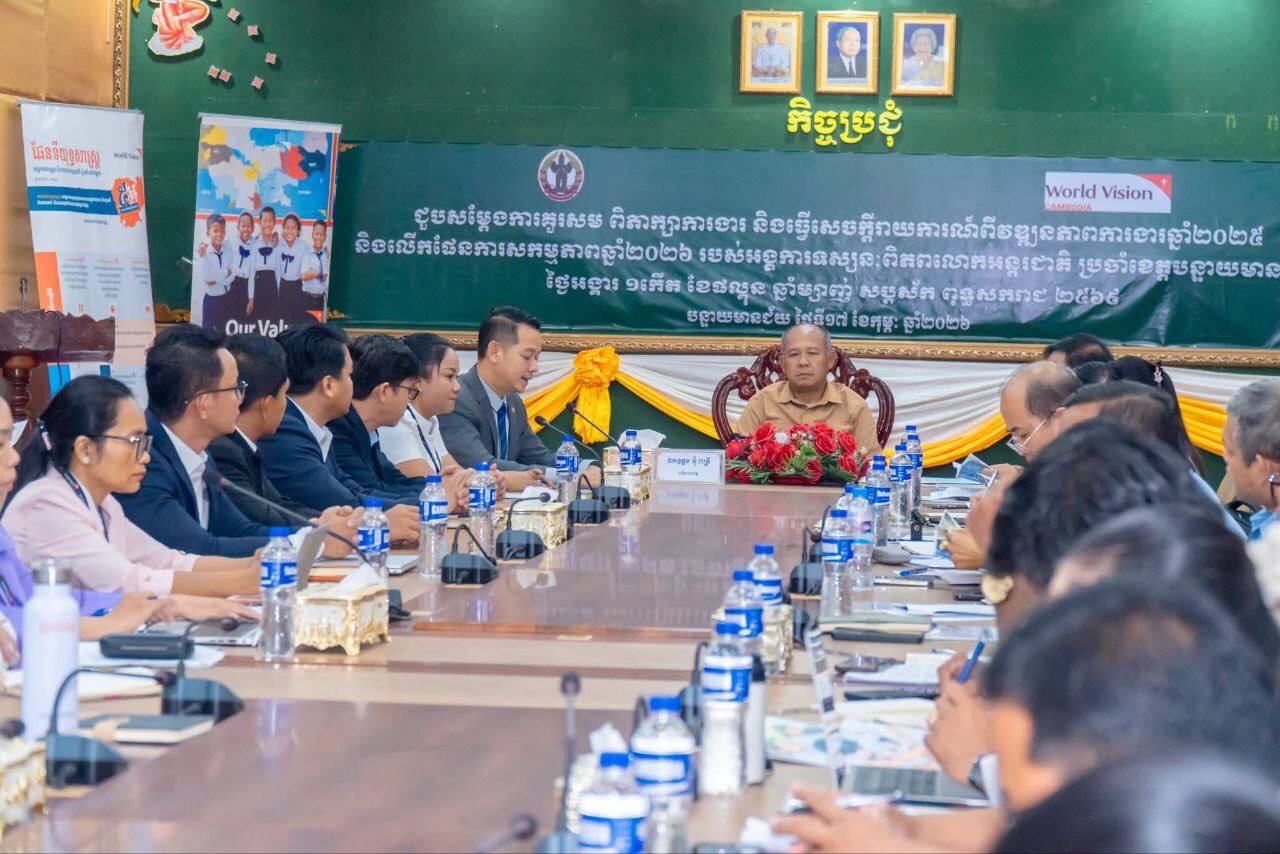 ខេត្តបន្ទាយមានជ័យ៖ អង្គការទស្សនៈពិភពលោក បានបង្ហាញលទ្ធផលការងារឆ្នាំ២០២៥ ដើម្បីពង្រឹងសុខុមាល ភាពកុមារ សម្រាប់អនុវត្ដបន្ដឆ្នាំ២០២៦ នៅខេត្ដបន្ទាយមានជ័យ ខណៈអង្គការទស្សនៈពិភព លោក អន្តរជាតិ (World Vision Intern ational) ប្រចាំខេត្តបន្ទាយមានជ័យ ចូលជួបសម្ដែងកាគួរសម លោក អ៊ុំ រាត្រី អភិបាលខេត្តបន្ទាយមានជ័យ កាលពីថ្ងៃទី១៧ ខែកុម្ភៈ ឆ្នាំ២០២៦ នៅសាលាខេត្ដ ។