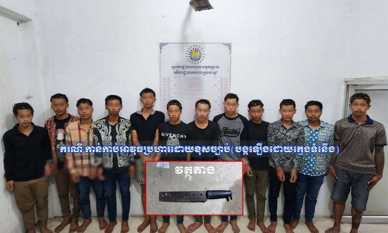 ករណីទី៣៖ ឃាត់ខ្លួនជនសង្ស័យចំនួន១១នាក់ ពាក់ព័ន្ធករណីកាន់កាប់អាវុធប្រហារដោយគ្មានការអនុញ្ញាត្តិ ប្រព្រឹត្តល្មើសនៅចំណុចលើមហាវិថីសុីជិនពីង ផ្លូវក្រវ៉ាត់ក្រុងទី៣ ស្ថិតក្នុងភូមិចុងកោះ សង្កាត់កោះអន្លង់ចិន ក្រុងតាខ្មៅ កាលពីថ្ងៃទី៩ខែកុម្ភៈឆ្នាំ២០២៦ វេលាម៉ោង០៤:២០នាទី។