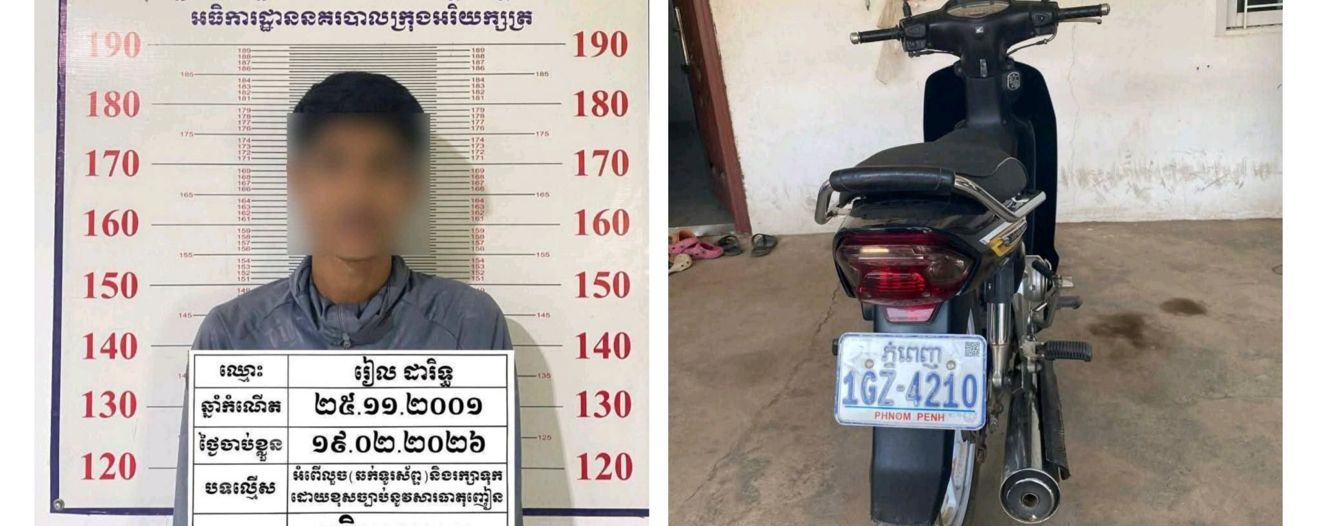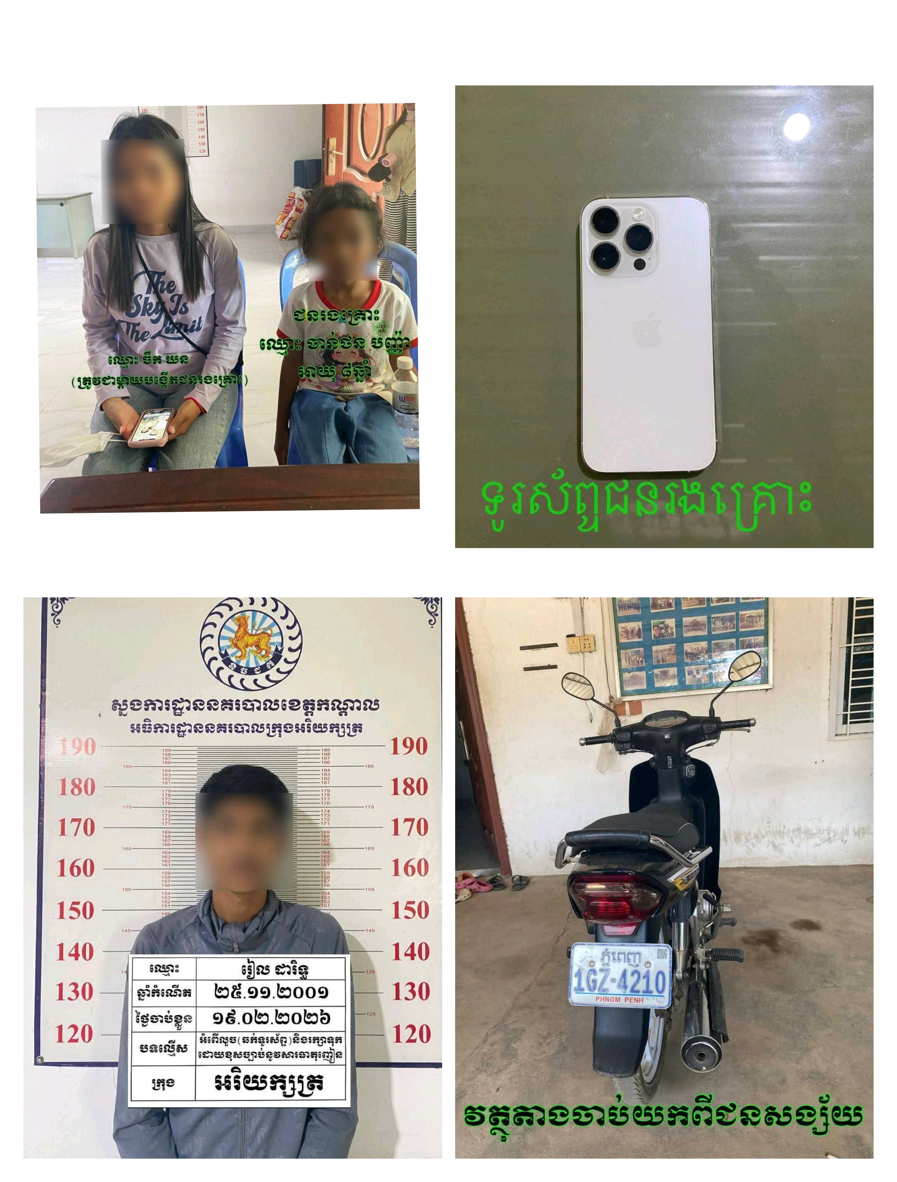 ខេត្តកណ្ដាល÷ បុរសជាសន្តិសុខម្នាក់ដែលមានសារធាតុញៀនក្នុងខ្លួន ត្រូវកម្លាំងនគរបាលក្រុងអរិយក្សត្រតាមប្រដេញ និងឃាត់ខ្លួនបានភ្លាមៗ បន្ទាប់ពីធ្វើសកម្មភាពជិះម៉ូតូឆក់យកទូរស័ព្ទដៃពីក្មេងស្រីម្នាក់ដែលកំពុងជិះ កង់តាមដងផ្លូវ។ ហេតុការណ៍ឆក់នេះបានកើតឡើងកាលពីថ្ងៃទី១៩ ខែកុម្ភៈ ឆ្នាំ២០២៦ វេលាម៉ោង ១២ និង ១០ នាទី នៅចំណុចតាមដងផ្លូវក្នុងភូមិព្រែកតាអុងទី២ សង្កាត់ពាមឧកញ៉ាអុង ក្រុងអរិយក្សត្រ ខេត្តកណ្តាល។