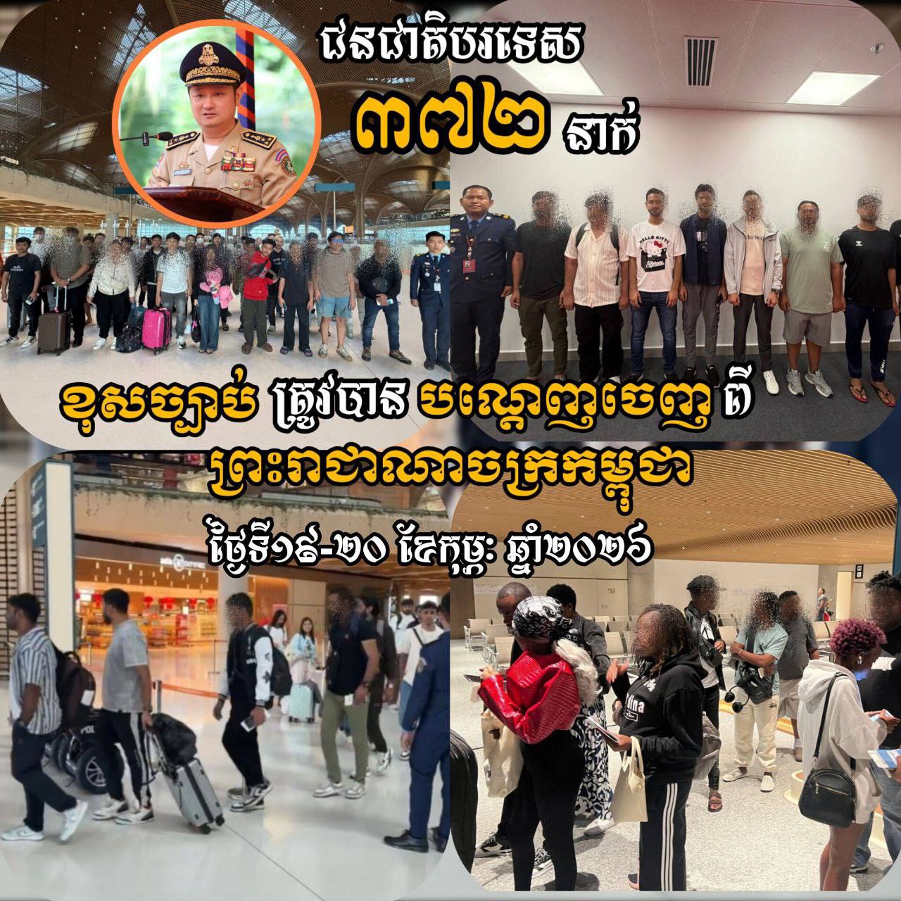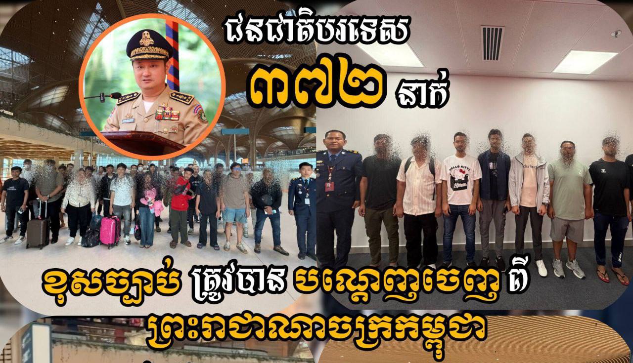 ភ្នំពេញ៖ អគ្គនាយកអន្តោប្រវេសន៍ នៃក្រសួងមហាផ្ទៃ នៅព្រឹកថ្ងៃទី២១ ខែកុម្ភៈ ឆ្នាំ២០២៦នេះបានឱ្យដឹងថា ដោយអនុវត្តតាមអនុសាសន៍ដ៏ខ្ពង់ខ្ពស់ របស់លោកអភិសន្តិបណ្ឌិត ឧបនាយករដ្ឋមន្ត្រី រដ្ឋមន្ត្រីក្រសួងមហាផ្ទៃ លោកសន្តិបណ្ឌិត និងថ្នាក់ដឹកនាំក្រសួងមហាផ្ទៃ លោកឧត្តមសេនីយ៍ឯក សុខ វាសនា អគ្គនាយកអន្តោប្រវេសន៍ នៅថ្ងៃទី ១៩-២០ ខែកុម្ភៈ ឆ្នាំ២០២៦ បានណែនាំឱ្យនាយកដ្ឋានស៊ើបអង្កេត និងអនុវត្តនីតិវិធី បន្តធ្វើការបណ្តេញជនបរទេសសរុបចំនួន ៣៧២នាក់ (ស្រី ៥៤នាក់) មាន ១៨សញ្ជាតិ ។ ក្នុងនោះរួមមាន៖ ជនជាតិចិន ម៉ាឡេស៊ី ឥណ្ឌា ស្រីលង្កា បង់ក្លាដេស ប៉ាគីស្ថាន ឥណ្ឌូនេស៊ី កេនយ៉ា នីហ្សេរីយ៉ា អេហ្ស៊ីប អេតូ្យពី ហ្គាណា យ៉ូហ្គង់ដា ហ្វីលីពីន ប្រេស៊ីល ន័រវែស អាហ្វ្រិកខាងត្បួង និងចិនតៃវ៉ាន់ ត្រូវបានបណ្ដេញចេញតាមប៉ុស្តិ៍នគរបាលច្រកទ្វារអាកាសអន្តរជាតិតេជោ ជនបរទេសទាំងអស់នេះពាក់ព័ន្ធករណីលួចឆ្លងដែន ស្នាក់នៅគ្មានលិខិតឆ្លងដែន និងធ្វើការងារខុសច្បាប់នៅក្នុងព្រះរាជាណាចក្រកម្ពុជា។