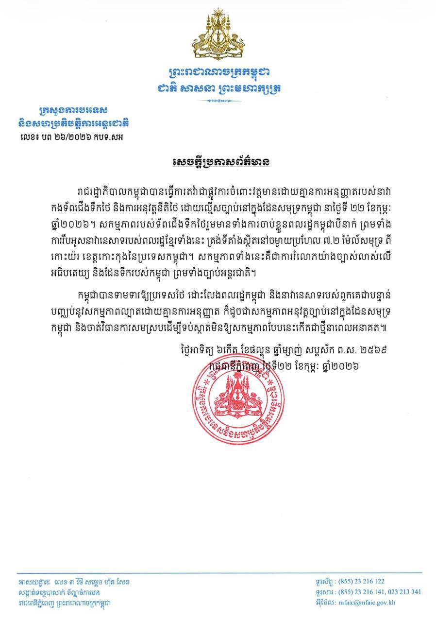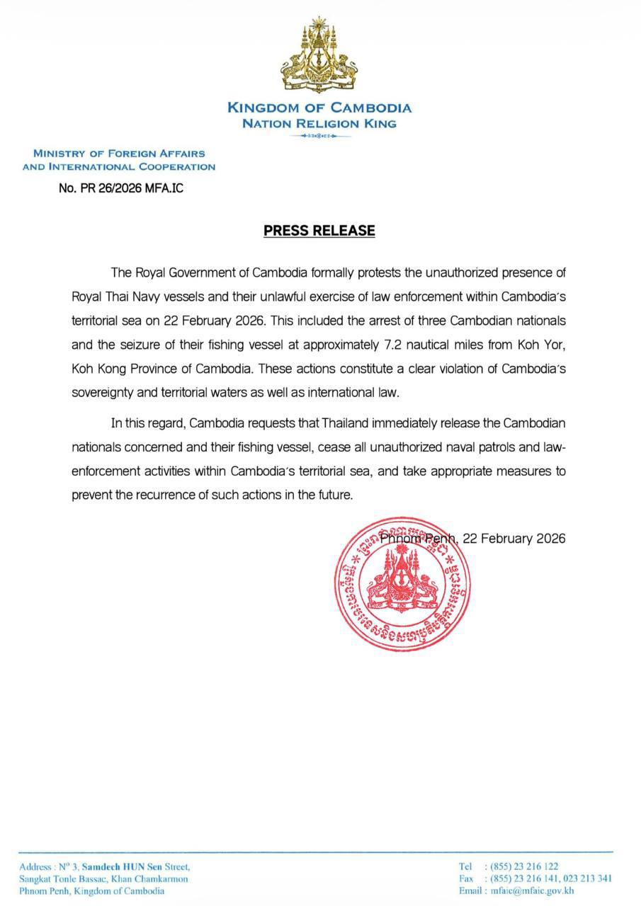 ភ្នំពេញ៖ រាជរដ្ឋាភិបាលកម្ពុជាបានធ្វើការតវ៉ាជាផ្លូវការចំពោះវត្តមានដោយគ្មានការអនុញ្ញាតរបស់នាវា កងទ័ពជើងទឹកថៃ និងការអនុវត្តនីតិថៃ ដោយល្មើសច្បាប់នៅក្នុងដែនសមុទ្រកម្ពុជា នាថ្ងៃទី ២២ ខែកុម្ភៈ ឆ្នាំ២០២៦។ សកម្មភាពរបស់ទ័ពជើងទឹកថៃរួមមានទាំងការចាប់ខ្លួនពលរដ្ឋកម្ពុជាបីនាក់ ព្រមទាំង ការរឹបអូសនាវានេសាទរបស់ពលរដ្ឋខ្មែរទាំងនេះ ត្រង់ទីតាំងស្ថិតនៅចម្ងាយប្រហែល ៧.២ ម៉ៃល៍សមុទ្រ ពី កោះយ៉រ ខេត្តកោះកុងនៃប្រទេសកម្ពុជា។