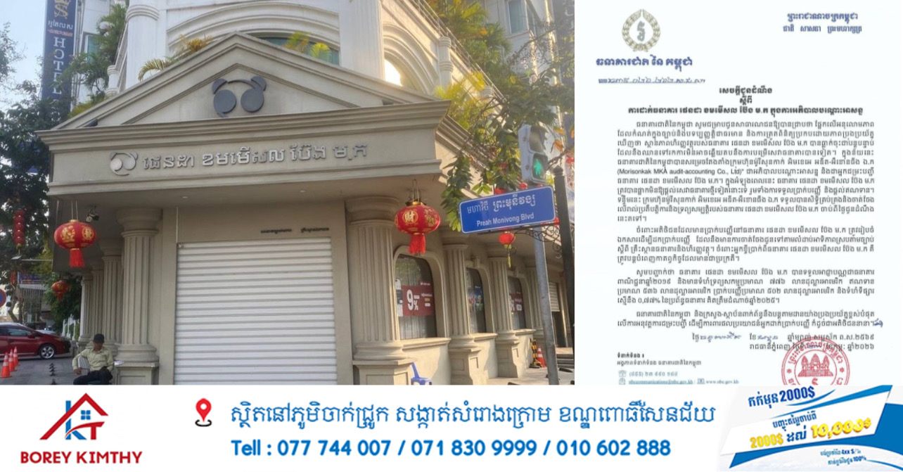 ធនាគារជាតិនៃកម្ពុជា សូមជម្រាបជូនសាធារណជនឱ្យបានជ្រាបថា ផ្អែកលើអនុលោមភាព ដែលកំណត់ក្នុងច្បាប់និងបទប្បញ្ញត្តិជាធរមាន និងការត្រួតពិនិត្យប្រកបដោយភាពប្រុងប្រយ័ត្ន ឃើញថា ស្ថានភាពហិរញ្ញវត្ថុរបស់ធនាគារ ផេនដា ខមមើសីល ប៊ែង ម.ក បានធ្លាក់ចុះជាបន្តបន្ទាប់ ដែលនឹងឈានទៅរកការមិនអាចឆ្លើយតបនឹងការបម្រើសេវាធនាគារបានទៀត។ ក្នុងន័យនេះ ធនាគារជាតិនៃកម្ពុជាបានសម្រេចតែងតាំងក្រុមហ៊ុនម៉ូរីសុនកាក់ អិមខេអេ អឌីត-អីខោនចឹង ឯ.ក (Morisonkak MKA audit-accounting Co., Ltd)* ជាអភិបាលបណ្តោះអាសន្ន និងជាអ្នកជម្រះបញ្ជី ធនាគារ ផេនដា ខមមើសល ប៊ែង ម.ក។ ក្នុងអំឡុងពេលនេះ ធនាគារ ផេនដា ខមមើសល ប៊ែង ម.ក ត្រូវបានផ្អាកមិនឱ្យផ្តល់សេវាធនាគារថ្មីទៀតនោះទេ រួមទាំងការទទួលប្រាក់បញ្ញើ និងផ្តល់ឥណទាន។ ទន្ទឹមនេះ ក្រុមហ៊ុនម៉ូរីសុនកាក់ អិមខេអេ អឌីត-អឺខោនធីង ឯ.ក ទទួលបានសិទ្ធិគ្រប់គ្រងនិងចាត់ចែង លើរាល់ប្រតិបត្តិការនិងទ្រព្យសម្បត្តិរបស់ធនាគារ ផេនដា ខមមើសល ប៊ែង ម.ក ចាប់ពីថ្ងៃជូនដំណឹង នេះតទៅ។