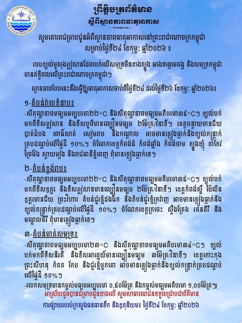 ភ្នំពេញ៖ ក្រសួងធនធានទឹក និងឧតុនិយម នៅព្រឹកថ្ងៃទី២៤ ខែកុម្ភៈ ឆ្នាំ២០២៦នេះ បានចេញសេចក្ដីជូនដំណឹងអំពីស្ថានភាពធាតុអាកាសនៅព្រះរាជាណាចក្រកម្ពុជា ខណៈរបបខ្យល់មូសុងឦសានដែលបក់លើសមុទ្រចិនខាងត្បូង អាងទន្លេមេគង្គ និងសមុទ្រកម្ពុជា មានឥទ្ធិពលលើព្រះរាជាណាចក្រកម្ពុជា។