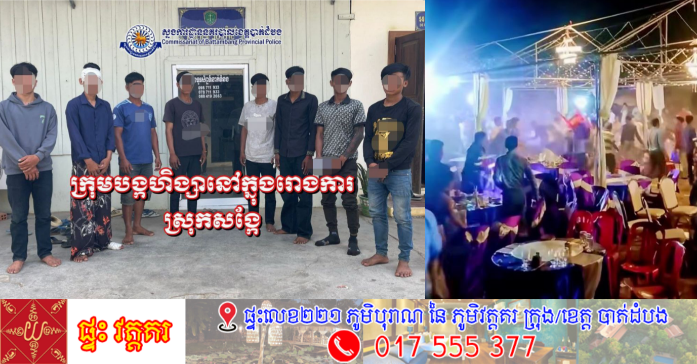 កិច្ចប្រតិបត្តិការឃាត់ខ្លួនក្រុមជនសង្ស័យខាងលើនេះធ្វើឡើងក្រោយពួកគេធ្វើសកម្មភាពបង្កការអុកឡុក ដោយយកកៅអីវាយនិងយកកែវចានគប់គ្នាទៅវិញ ទៅមកនៅវេលាម៉ោង ២២និង៣០នាទី ថ្ងៃទី២២ ខែកុម្ភៈ ឆ្នាំ២០២៦ នៅចំណុចកម្មវិធីមង្គលការមួយកន្លែង ស្ថិតនៅក្នុងក្រុមទី១៥ ភូមិបឹងទឹម ឃុំតាប៉ុន ស្រុកសង្កែ ខេត្តបាត់ដំបង។