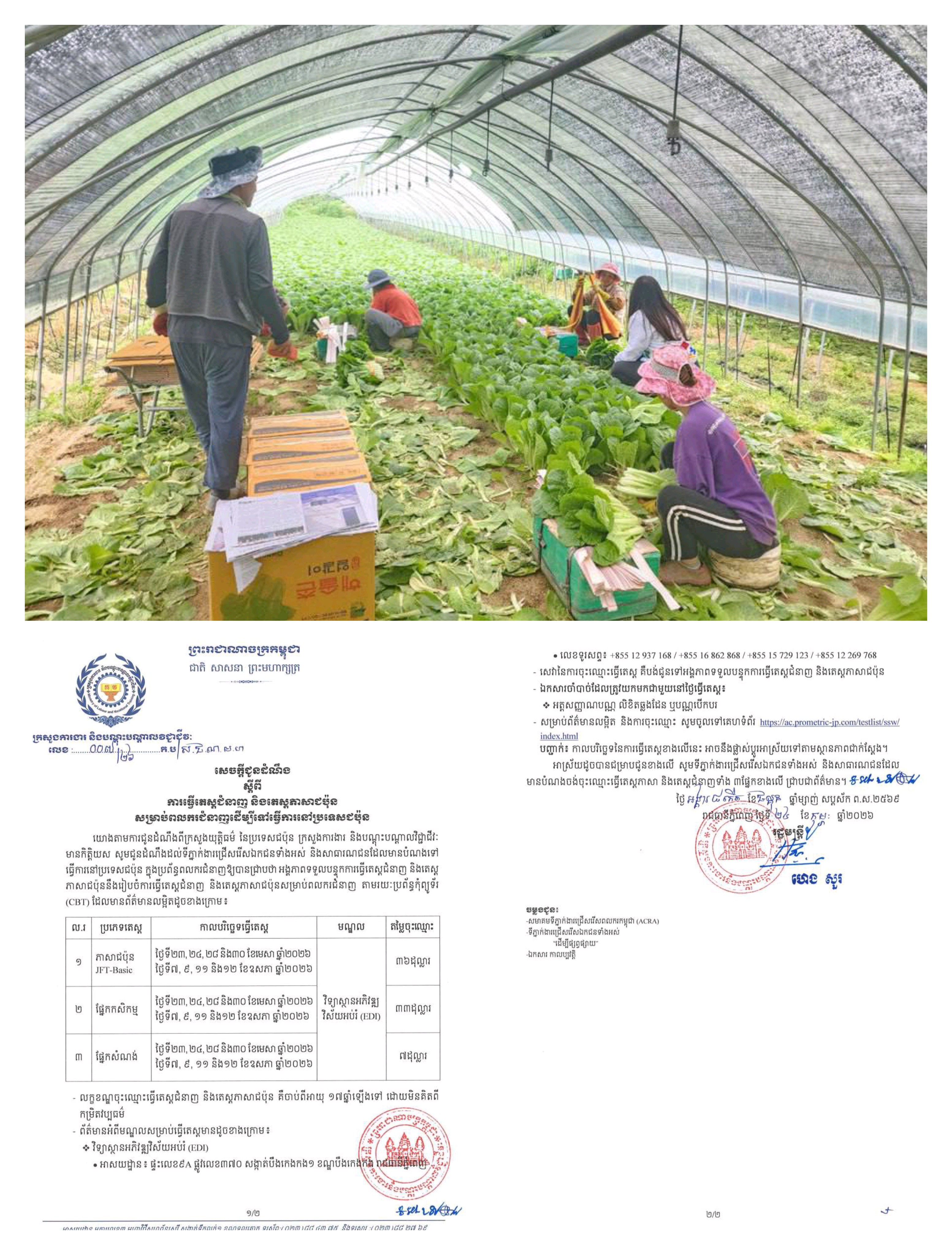 បើតាមការបញ្ជាក់ពីរដ្ឋមន្ត្រីក្រសួងការងារ និងបណ្ដុះបណ្ដាលវិជ្ជាជីវៈ លោក ហេងសួរ បានឱ្យដឹងនៅក្នុងសេចក្ដីជូនដំណឹងមួយទើបទទួលបាននៅថ្ងៃទី២៥ ខែកុម្ភៈ ឆ្នាំ២០២៦នេះថា៖ អង្គភាពទទួលបន្ទុកការធ្វើតេស្តជំនាញ និងតេស្ត ភាសាជប៉ុន នឹងរៀបចំការធ្វើតេស្តជំនាញ និងតេស្តភាសាជប៉ុនសម្រាប់ពលករជំនាញ តាមរយៈប្រព័ន្ធកុំព្យូទ័រ (CBT) ក្នុងគម្រោងពលករជំនាញជាបន្តបន្ទាប់ក្នុងនោះប្រភេទតេស្តភាសាជប៉ុន ជំនាញផ្នែកសំណង់ និងកសិកម្មធ្វើនៅថ្ងៃខែដូចគ្នានៅវិទ្យាស្ថានអភិវឌ្ឍន៍ វិស័យអប់រំដែលស្ថិតនៅផ្ទះលេខ៩A ផ្លូវលេខ៣៧០ សង្កាត់បឹងកេងកង១ ខណ្ឌបឹងកេងកង រាជធានីភ្នំពេញ ដែលមានលេខទូរសព្ទ៖ +855 12 937 168/+855 16 862 868/+855 15 729 123/+855 12 269 768 ក្នុងនោះរួមមានថ្ងៃទី២៣,២៤,២៥ និង៣០ខែមេសា ឆ្នាំ២០២៦ និងថ្ងៃទី៧, ៩, ១១ និង១២ខែឧសភាឆ្នាំ២០២៦។