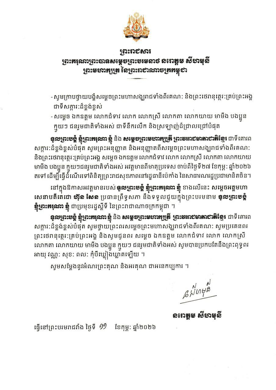 ទូលព្រះបង្គំ ខ្ញុំព្រះករុណា ខ្ញុំ និង សម្តេចព្រះមហាក្សត្រី ព្រះវររាជមាតាជាតិខ្មែរ ជាទីគោរព សក្ការៈដ៏ខ្ពង់ខ្ពស់បំផុត សូមព្រះអនុញ្ញាត និងអនុញ្ញាតពីសម្តេចព្រះមហាសង្ឃរាជទ និងព្រះថេរានុត្ថេរៈគ្រប់ព្រះអង្គ សម្តេច ឯកឧត្តម លោកជំទាវ លោក លោកស្រី លោកតា លោកយាយ មាមីង បងប្អូន ក្មួយៗជនរួមជាតិទាំងអស់ អវត្តមានពីមាតុប្រទេស ចាប់ពីថ្ងៃទី២៧ ខែកុម្ភៈ ឆ្នាំ២០២៦ តទៅ ដើម្បីធ្វើដំណើរទៅពិនិត្យព្រះរាជសុខភាពនៅរដ្ឋធានីប៉េកាំង នៃសាធារណរដ្ឋប្រជាមានិតចិន។