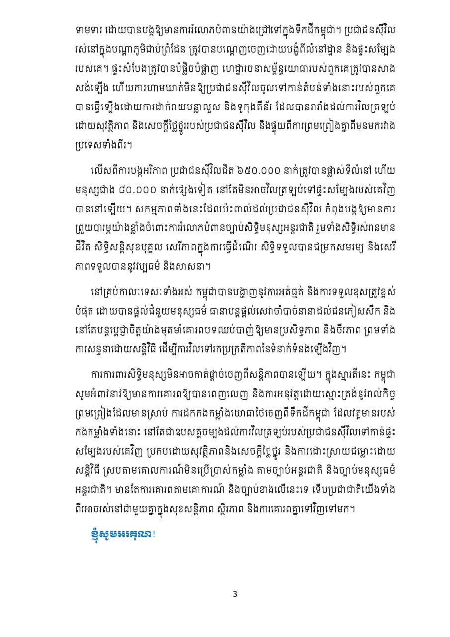 ការការពារសិទ្ធិមនុស្សមិនអាចកាត់ផ្តាច់ចេញពីសន្តិភាពបានឡើយ។ ក្នុងស្មារតីនេះ កម្ពុជា សូមអំពាវនាវឱ្យមានការគោរពឱ្យបានពេញលេញ និងការអនុវត្តដោយស្មោះត្រង់នូវរាល់កិច្ច ព្រមព្រៀងដែលមានស្រាប់ ការដកកងកម្លាំងយោធាថៃចេញពីទឹកដីកម្ពុជា ដែលវត្តមានរបស់ កងកម្លាំងទាំងនោះ នៅតែជាឧបសគ្គចម្បងដល់ការវិលត្រឡប់របស់ប្រជាជនស៊ីវិលទៅកាន់ផ្ទះ សម្បែងរបស់គេវិញ ប្រកបដោយសុវត្ថិភាពនិងសេចក្តីថ្លៃថ្នូរ និងការដោះស្រាយជម្លោះដោយ សន្តិវិធី ស្របតាមគោលការណ៍មិនប្រើប្រាស់កម្លាំង តាមច្បាប់អន្តរជាតិ និងច្បាប់មនុស្សធម៌ អន្តរជាតិ។ មានតែការគោរពតាមគោការណ៍ និងច្បាប់ខាងលើនេះទេ ទើបប្រជាជាតិយើងទាំង ពីរអាចរស់នៅជាមួយគ្នាក្នុងសុខសន្តិភាព ស្ថិរភាព និងការគោរពគ្នាទៅវិញទៅមក៕ ដោយ៖តារា