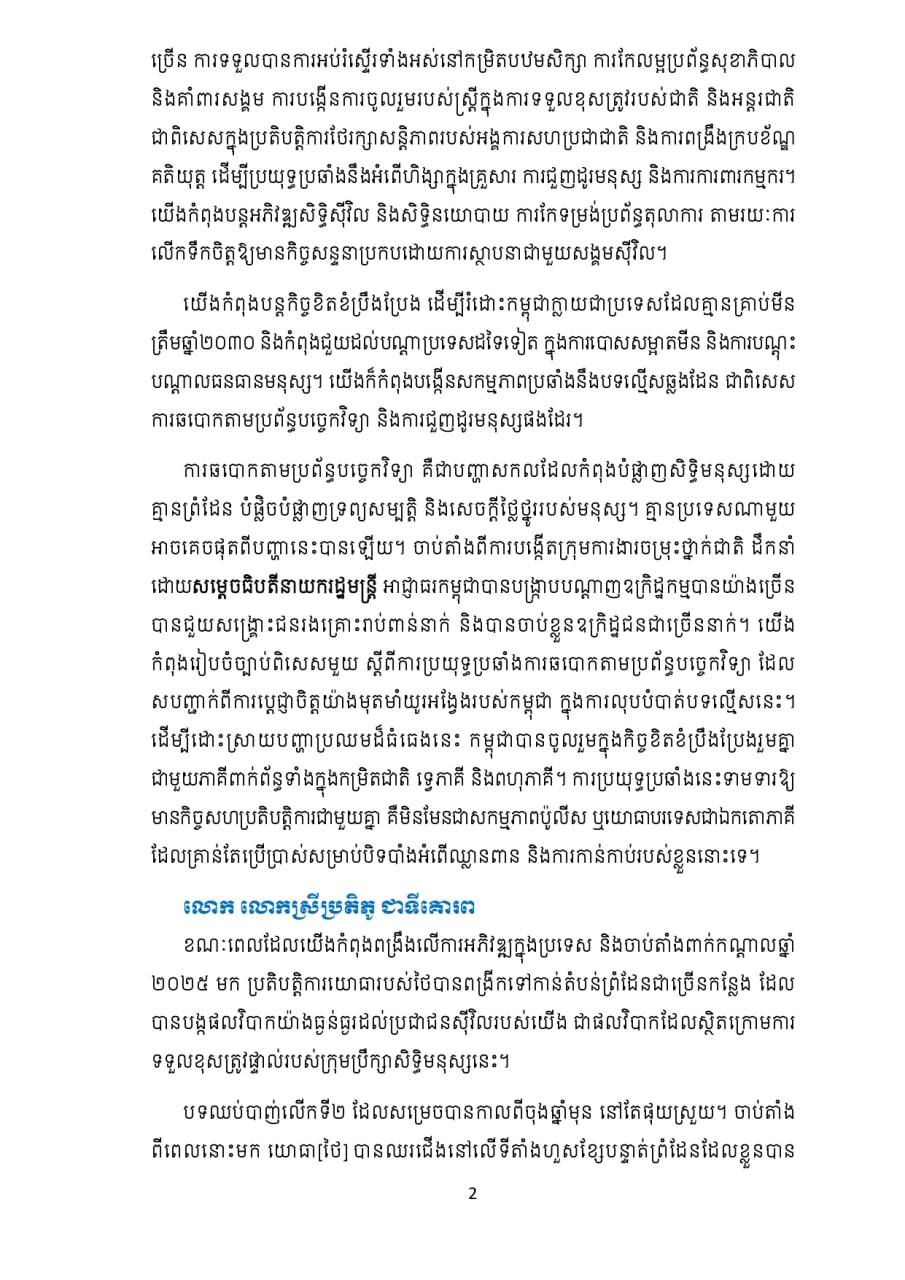 ខណៈពេលដែលយើងកំពុងពង្រឹងលើការអភិវឌ្ឍក្នុងប្រទេស និងចាប់តាំងពាក់កណ្តាលឆ្នាំ ២០២៥ មក ប្រតិបត្តិការយោធារបស់ថៃបានពង្រីកទៅកាន់តំបន់ព្រំដែនជាច្រើនកន្លែង ដែល បានបង្កផលវិបាកយ៉ាងធ្ងន់ធ្ងរដល់ប្រជាជនស៊ីវិលរបស់យើង ជាផលវិបាកដែលស្ថិតក្រោមការ ទទួលខុសត្រូវផ្ទាល់របស់ក្រុមប្រឹក្សាសិទ្ធិមនុស្សនេះ។