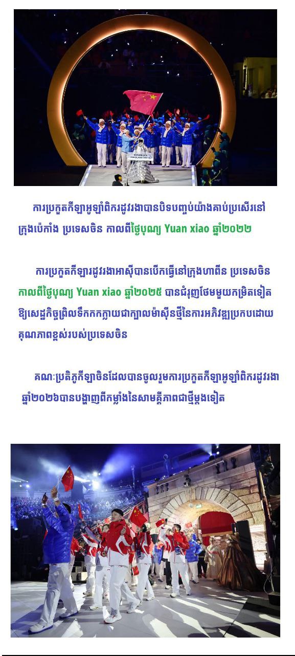 * ការប្រកួតកីឡាអូឡាំពិករដូវរងាបានបិទបញ្ចប់យ៉ាងគាប់ប្រសើរនៅក្រុងប៉េកាំងប្រទេសចិនកាលពីថ្ងៃបុណ្យ Yuan xiao ឆ្នាំ២០២២ , កាលពីថ្ងៃបុណ្យ Yuan xiao ឆ្នាំ២០២៥ ការប្រកួតកីឡារដូវរងាអាស៊ីបានបើកធ្វើនៅក្រុងហាពីន ប្រទេសចិន បានជំរុញថែមមួយកម្រិតទៀតឱ្យសេដ្ឋកិច្ចព្រិលទឹកកកក្លាយជាក្បាលម៉ាស៊ីនថ្មីនៃការអភិវឌ្ឍប្រកបដោយគុណភាពខ្ពស់របស់ប្រទេសចិន។ គណៈប្រតិភូកីឡាចិនដែលបានចូលរួមការប្រកួតកីឡាអូឡាំពិករដូវរងាឆ្នាំ២០២៦ បានបង្ហាញពីកម្លាំងនៃសាមគ្គីភាពជាថ្មីម្តងទៀត ៕
