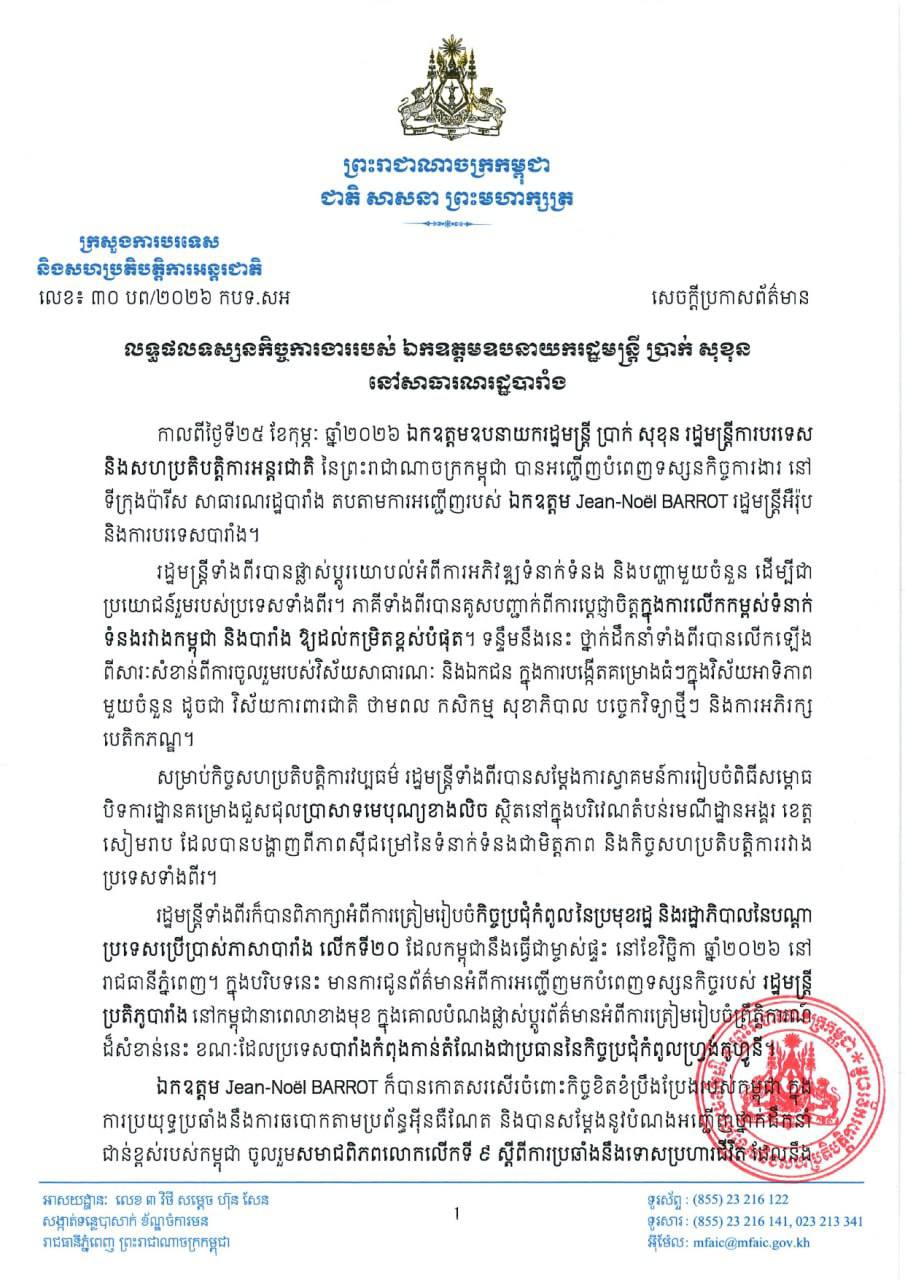 ប្រទេសបារាំង៖ ក្រសួងការបរទេស និងសហប្រតិបត្តិការអន្តរជាតិ នៅថ្ងៃទី០៣ ខែកុម្ភៈ ឆ្នាំ២០២៦នេះ បានចេញសេចក្ដីប្រកាសព័ត៌មានរបស់ លោកឧបនាយករដ្ឋមន្ត្រី ប្រាក់ សុខុន រដ្ឋមន្ត្រីការបរទេស និងសហប្រតិបត្តិការអន្តរជាតិ នៃព្រះរាជាណាចក្រកម្ពុជា កាលពីថ្ងៃទី២៥ ខែកុម្ភៈ ឆ្នាំ២០២៦ បានអញ្ជើញបំពេញទស្សនកិច្ចការងារ នៅ ទីក្រុងប៉ារីស សាធារណរដ្ឋបារាំង តបតាមការអញ្ជើញរបស់ លោក Jean-Noël BARROT រដ្ឋមន្ត្រីអឺរ៉ុប និងការបរទេសបារាំង។