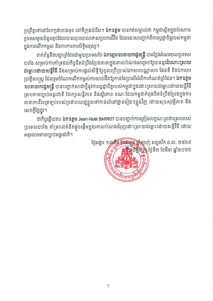 ពាក់ព័ន្ធនឹងបញ្ហាព្រំដែនជាមួយប្រទេសថៃ លោកឧបនាយករដ្ឋមន្ត្រី បានថ្លែងអំណរគុណប្រទេសបារាំង សម្រាប់ការគាំទ្រដល់កិច្ចខិតខំប្រឹងប្រែងនានាក្នុងគោលបំណងសម្រេចឱ្យបាននូវដំណោះស្រាយ ជម្លោះដោយសន្តិវិធី និងសម្រាប់ការផ្តល់សិទ្ធិឱ្យចូលប្រើប្រាស់ឯកសារបណ្ណាសារ ផែនទី និងឯកសារ ប្រវត្តិសាស្ត្រ ដែលរួមចំណែកលើកកម្ពស់ការយល់ដឹងឱ្យកាន់តែប្រសើរអំពីការកំណត់ព្រំដែន។ លោកឧបនាយករដ្ឋមន្ត្រី បានបញ្ជាក់សាជាថ្មីនូវការប្តេជ្ញាចិត្តរបស់កម្ពុជាក្នុងដោះស្រាយជម្លោះដោយសន្តិវិធី ស្របតាមច្បាប់អន្តរជាតិ ថែរក្សាសន្តិភាព និងស្ថិរភាព ខណៈដែលកម្ពុជាកំពុងខិតខំប្រឹងប្រែងក្នុងការ ធានាការវិលត្រឡប់របស់ប្រជាពលរដ្ឋខ្លួនទៅកាន់លំនៅដ្ឋានរៀងៗខ្លួនវិញ ដោយសុខសុវត្ថិភាព និង សេចក្តីថ្លៃថ្នូរ។