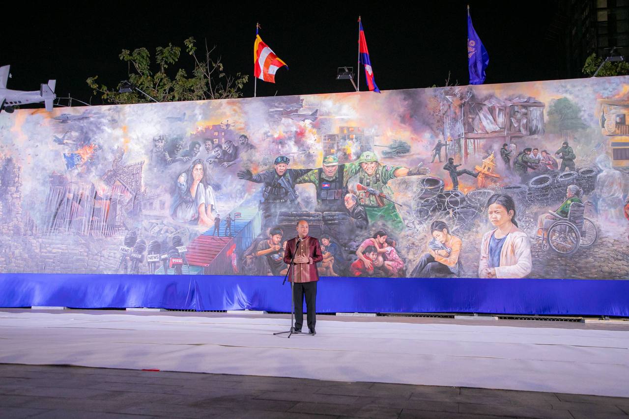 ក្នុងឱកាសនោះ លោកឧបនាយករដ្ឋមន្ត្រីហ៊ុន ម៉ានី បានមានប្រសាសន៍ថា៖ ផ្ទាំងគំនូរ “សិល្បៈដើម្បីសន្តិភាព” នេះជាផ្ទាំងគំនូរទី២ បន្ទាប់ពីសម្រេចបានផ្ទាំងគំនូរទី១នៅខេត្តសៀមរាប។គិតមកដល់ថ្ងៃនេះមិនបាន២សប្តាហ៍ផង យើងសម្រេចបានលទ្ធផលដែលជាអ្វីមាននៅក្នុងអារម្មណ៍របស់ខ្លួន។ផ្ទាំងគំនូរបានឆ្លុះបញ្ចាំងពីស្មារតី ការឈឺចាប់ អ្វីដែលជាទុក្ខវេទនានិងកំហឹងដែលយើងបានជួបប្រទះទាំងអស់គ្នានៅក្នុងឆ្នាំ២០២៥។ផ្ទាំងគំនូរនេះគ្រប់រូបភាពទាំងអស់ វាស្ថិតនៅក្នុងអារម្មណ៍របស់បងប្អូនប្រជាពលរដ្ឋខ្មែរទាំងអស់មិនថានៅក្នុងនិងនៅក្រៅប្រទេសនោះទេ។ យើងឆ្លងកាត់នូវការឈឺចាប់ យើងឆ្លងកាត់នូវការប្រមាថ ការមើលងាយ ការជាន់ឈ្លី ការធ្វើទុក្ខបុកម្នេញ និងរឿងអយុត្តិធម៌ដែលបានកើតឡើងមកលើយើងរាប់មិនអស់នៅក្នុងឆ្នាំ២០២៥ អារម្មណ៍របស់យើងមិនខុសគ្នាទេ។ អារម្មណ៍យើងសោកសៅបែបណា បានដាក់នៅលើផ្ទាំងគំនូរនេះទាំងអស់ ដែលបានឆ្លុះបញ្ជាំងពីអារម្មណ៍របស់ប្រជាពលរដ្ឋខ្មែរយើងទាំងអស់។
