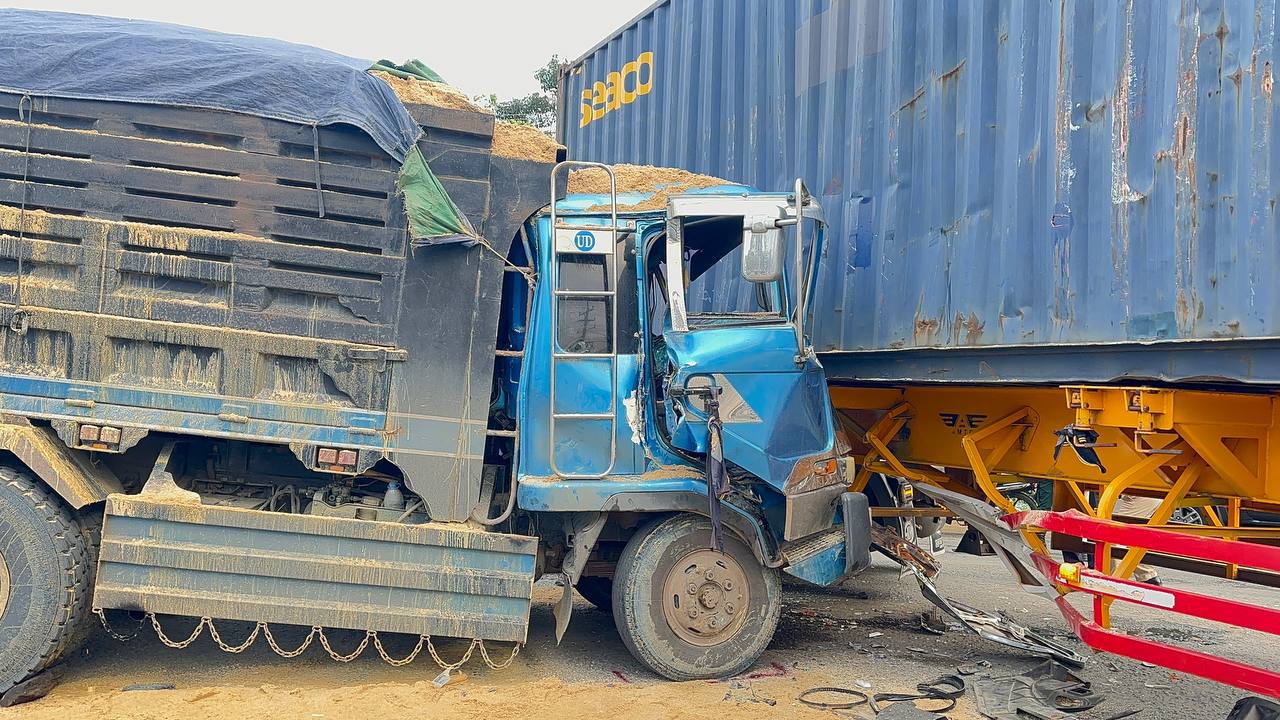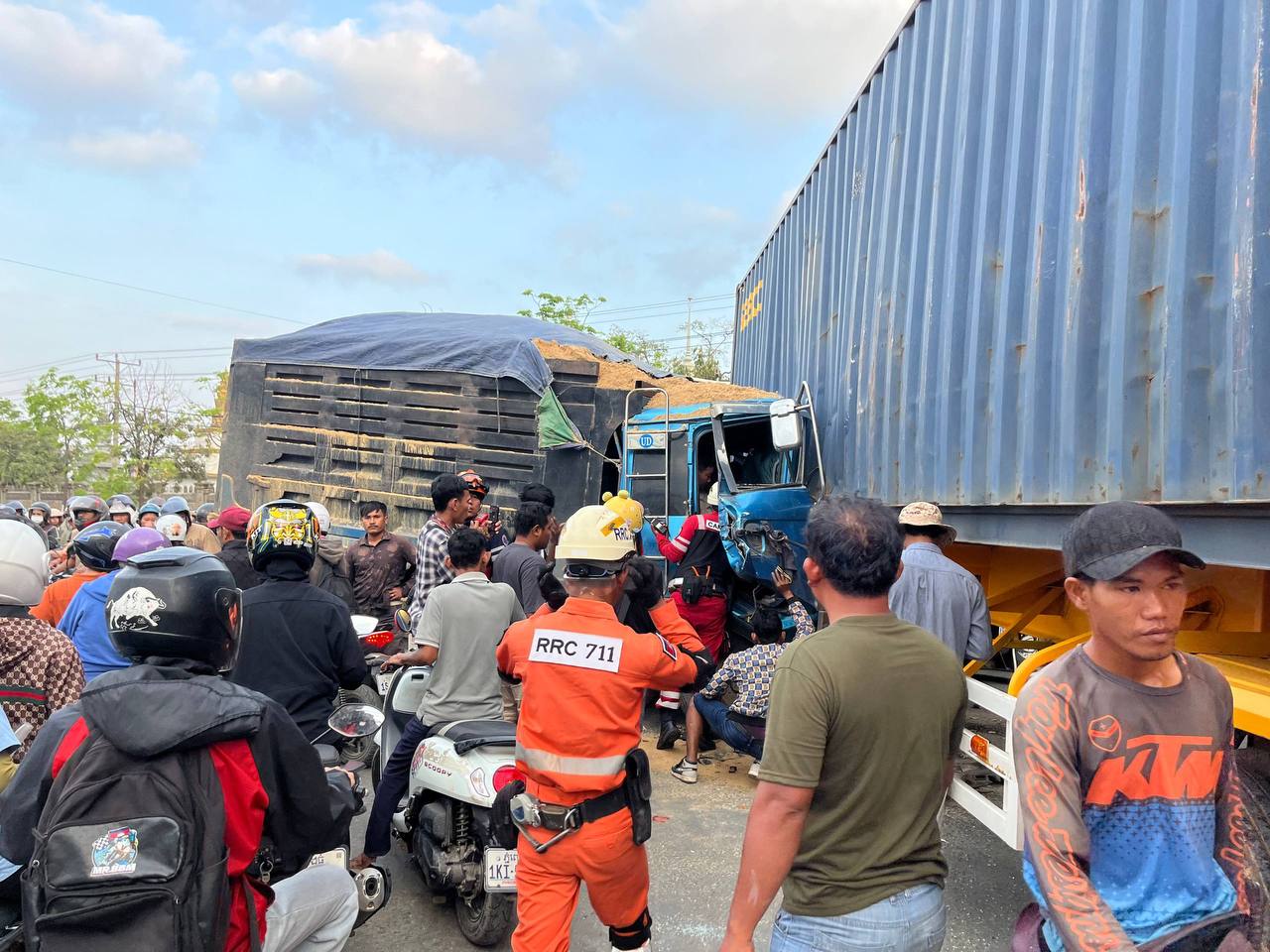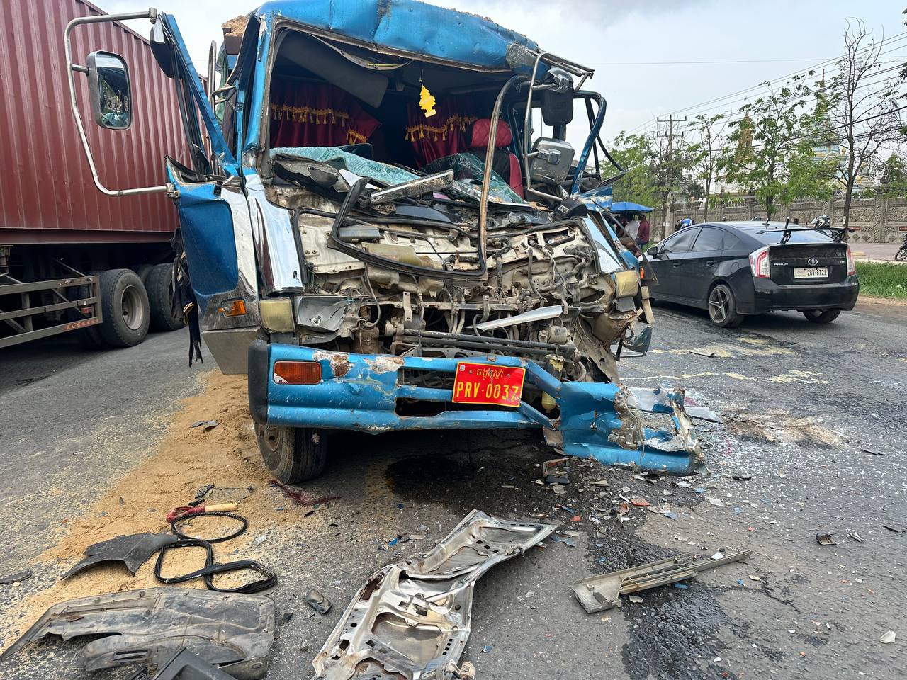 កេីតលឿនចាប់ហ្វ្រ័ងមិនជាប់ក៏ជ្រុលទៅបុកចំពាក់កណ្តាលនៃរថយន្តកុងតឺន័របណ្តាលឱ្យគាបជាប់តៃកុង។