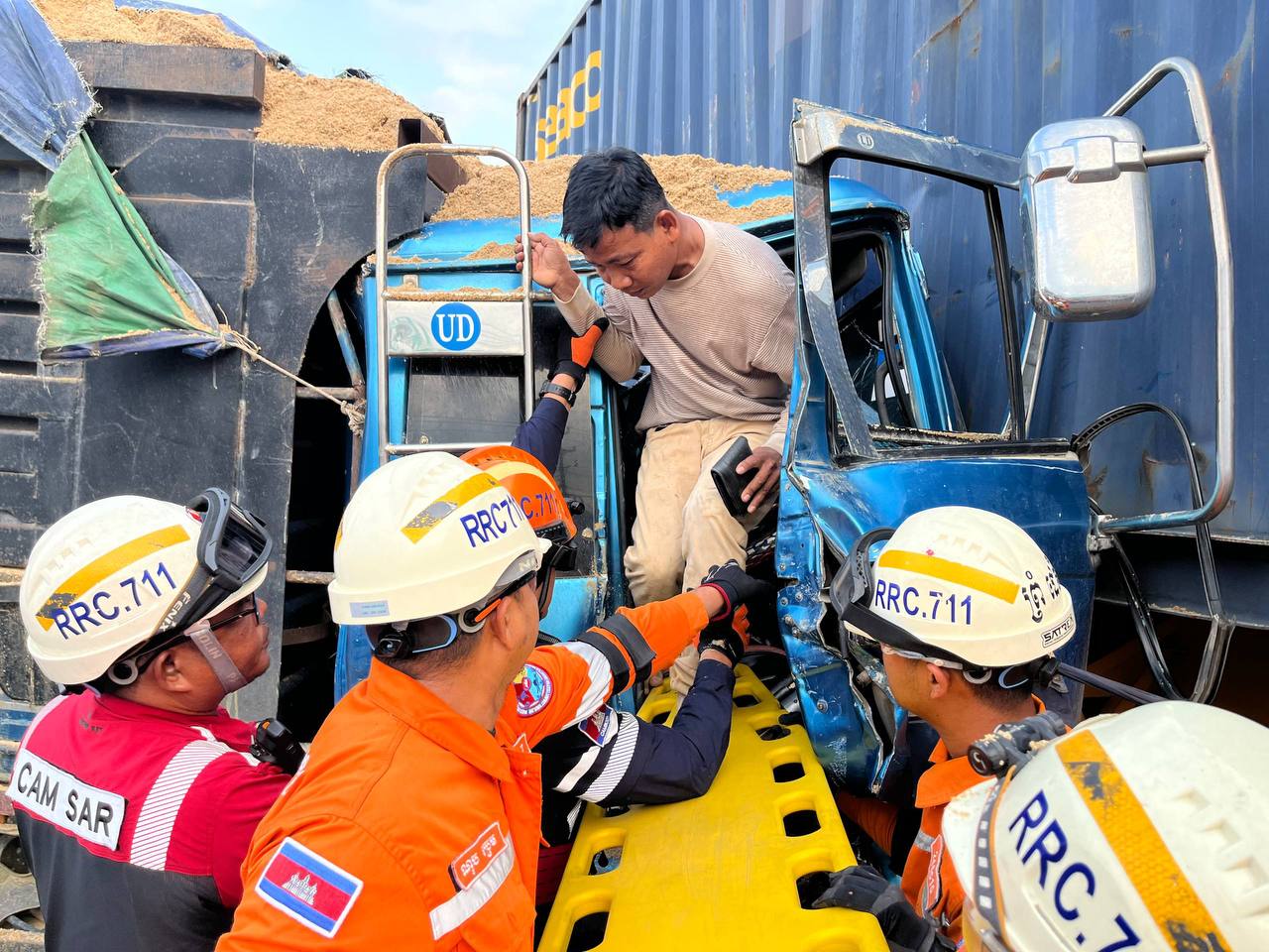 ភ្នំពេញ៖ បុរសម្នាក់បេីករថយន្តហុីយ៉ាន់ដាយដឹកខ្សាច់លឿនជាន់ហ្រ្វ័ងមិនទាន់ជ្រុលទៅបុកចំពាក់កណ្តាលរថយន្តកុងតឺន័របណ្តាលឱ្យគាបតៃកុងជាប់ត្រូវបានកងសង្គ្រោះ៧១១ កងពលតូចលេខ៧០ជួយកាត់គាស់សង្គ្រោះយកចេញនៅវេលាម៉ោង៦និង៣០នាទីព្រឹក ថ្ងៃទី៥ ខែមីនា ឆ្នាំ២០២៦ នៅតាមបណ្តោយផ្លូវជាតិលេខ៤ ក្នុងសង្កាត់កន្ទោក ខណ្ឌកំបូល រាជធានីភ្នំពេញ ។