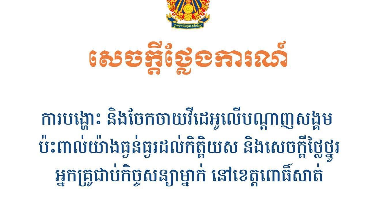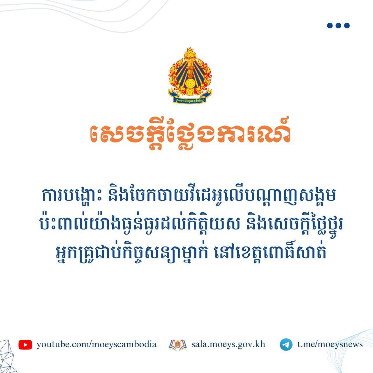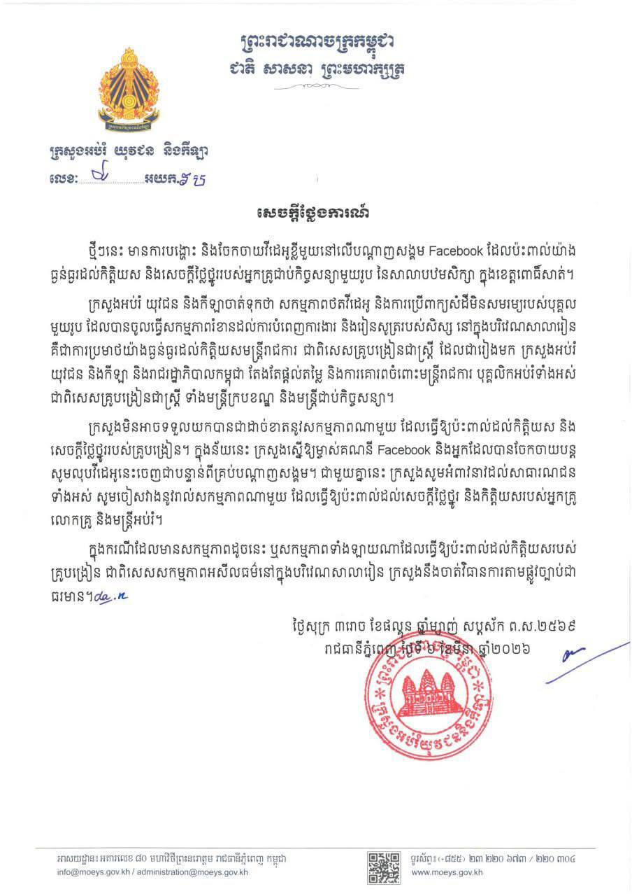 ភ្នំពេញ៖ ក្រសួងអប់រំ យុវជន និងកីឡា បានចេញសេចក្ដីថ្លែងការណ៍នៅព្រឹកថ្ងៃទី០៦ ខែមីនា ឆ្នាំ២០២៦នេះថា៖ ថ្មីៗនេះ មានការបង្ហោះ និងចែកចាយវីដេអូខ្លីមួយនៅលើបណ្តាញសង្គម Facebook ដែលប៉ះពាល់យ៉ាងធ្ងន់ធ្ងរដល់កិត្តិយស និងសេចក្តីថ្លៃថ្នូររបស់អ្នកគ្រូជាប់កិច្ចសន្យាម្នាក់ នៃសាលាបឋមសិក្សា ក្នុងខេត្តពោធិ៍សាត់។