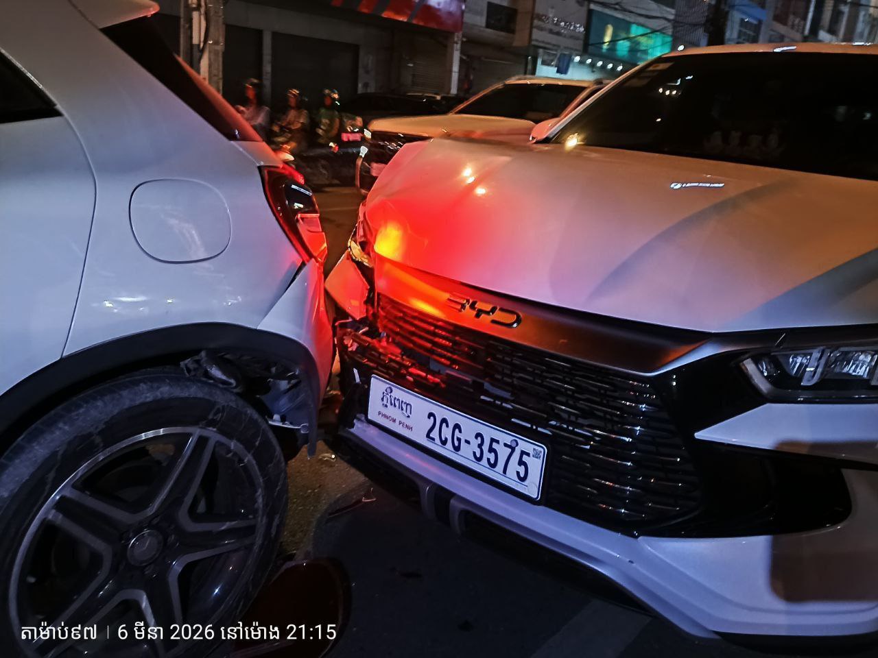 ភ្នំពេញ÷គ្រោះថ្នាក់ចតាចរណ៍មួយបានកើតឡើងរវាងរថយន្តរថយន្ត BYD ពាក់ស្លាកលេខភ្នំពេញ 2CG-3575 បើកបុករថយន្តម៉ាកសឺដេស ពាក់ស្លាកលេខភ្នំពេញ 2BE-7865 ដែលកំពុងឈប់រងចាំភ្លើងស្តុប ពីក្រោយបណ្ដាលឲ្យរងការខូចខាត នៅត្រង់ចំណុចស្តុបអតីតរង្វង់មូលទួលគោក។