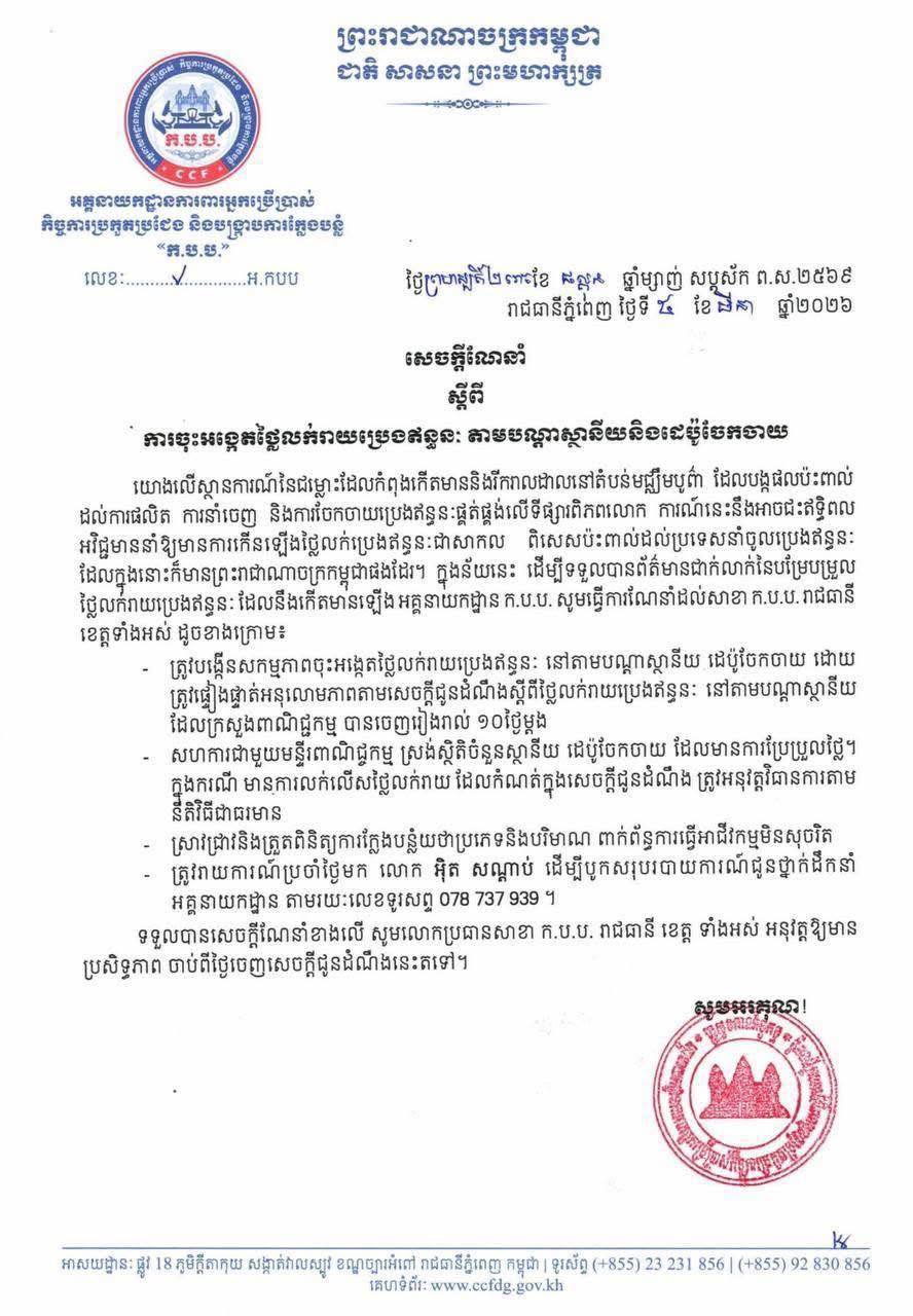 ទទួលបានសេចក្តីណែនាំខាងលើ សូមលោកប្រធានសាខា ក.ប.ប. រាជធានី ខេត្ត ទាំងអស់ អនុវត្តឱ្យមាន ប្រសិទ្ធភាព ចាប់ពីថ្ងៃចេញសេចក្តីជូនដំណឹងនេះតទៅ៕