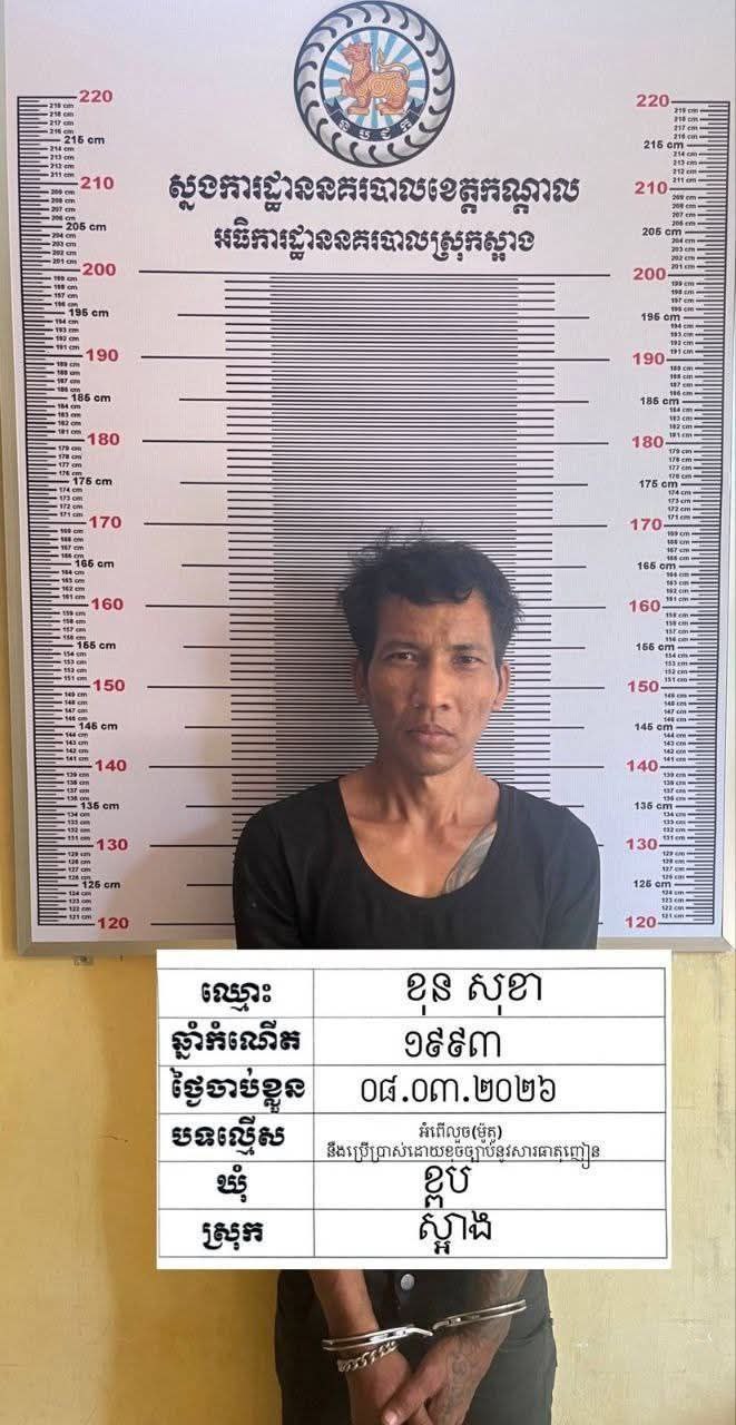 ខេត្តកណ្តាល÷ សមត្ថកិច្ចបានឃាត់ខ្លួនជនសង្ស័យម្នាក់ ដែលមានប្រវត្តិធ្លាប់ជាប់ពន្ធនាគាររយ:ពេល ២ឆ្នាំ ៦ខែ ពីបទប្រើ ប្រាស់និងជួញដូរនូសារធាតុញៀនដោយខុស ច្បាប់ តែពេលបានចេញមកវិញ បែរជាលួចម៉ូតូ អ្នកភូមិបន្តទៀត។ ហេតុការណ៍កើតឡើង កាលពីវេលាម៉ោង ១៦និង៥០នាទីថ្ងៃទី០៥ខែមីនាឆ្នាំ២០២៦នៅចំណុចក្នុងផ្ទះជនរងគ្រោះ ស្ថិតក្នុងភូមិឬស្សីស្រុក ឃុំខ្ពប ស្រុកស្អាង ខេត្តកណ្តាល និងត្រូវសមត្ថកិច្ចឃាត់ខ្លួនបាននៅថ្ងៃទី ០៨ខែមីនាឆ្នាំ២០២៦ ។