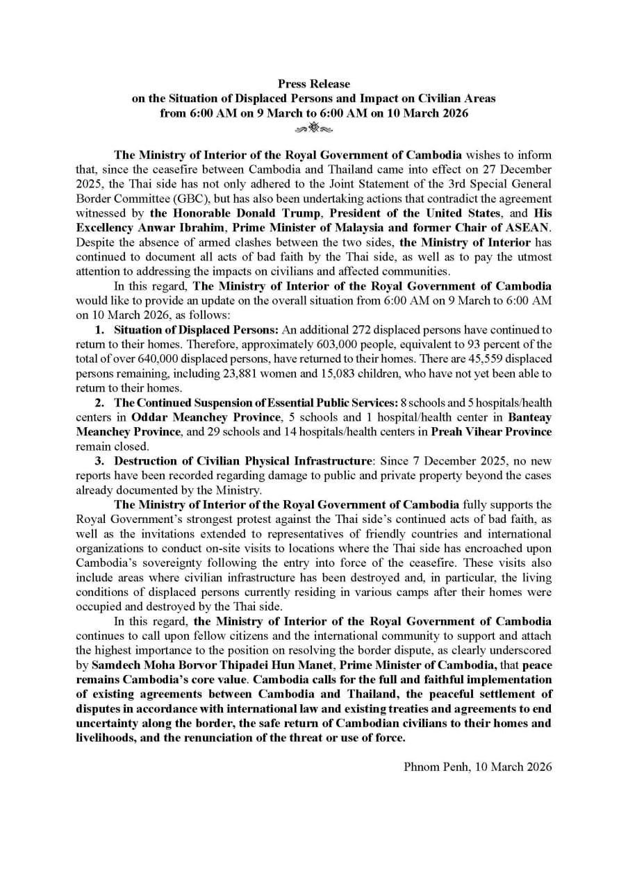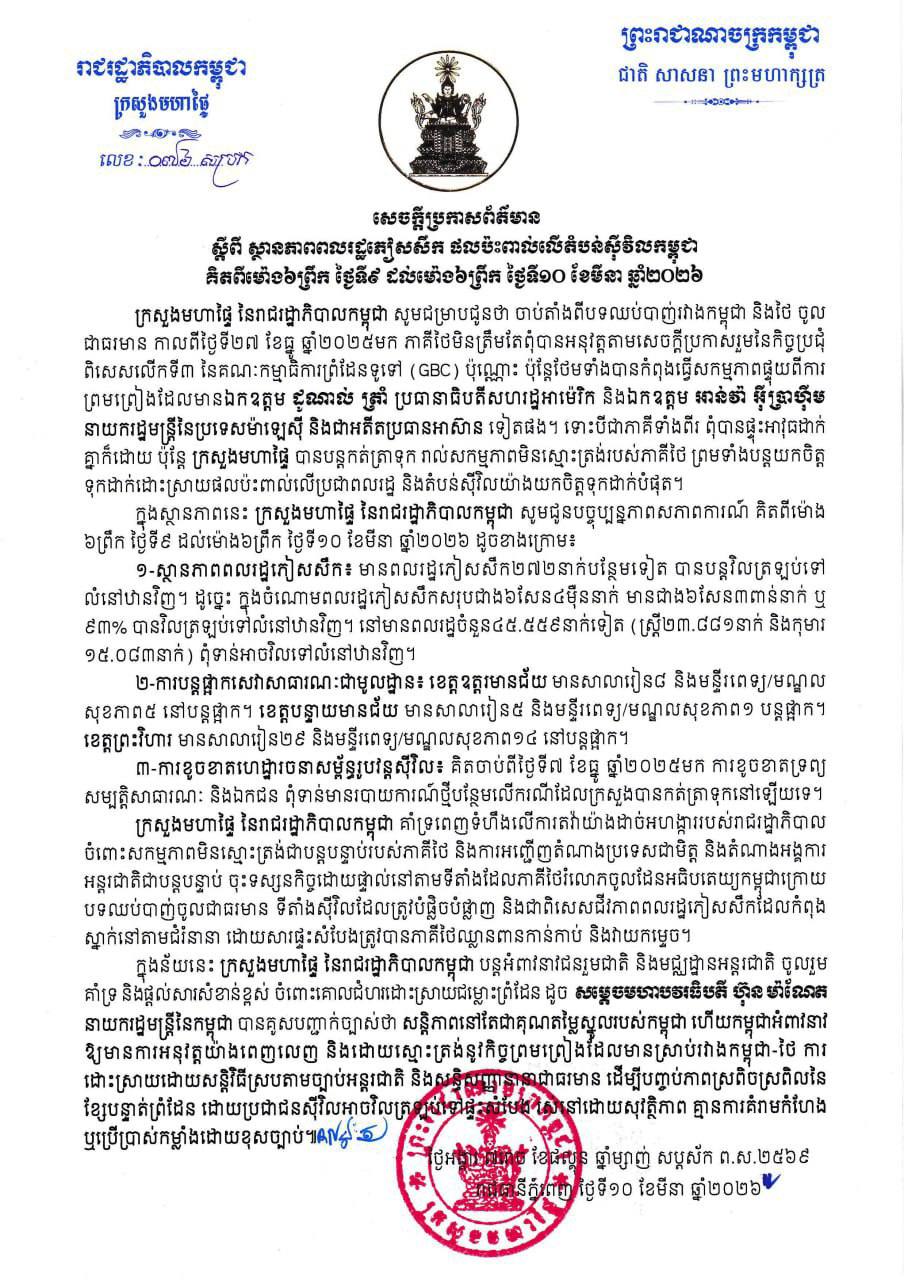 ភ្នំពេញ៖ ក្រសួងមហាផ្ទៃ នៃរាជរដ្ឋាភិបាលកម្ពុជា នៅថ្ងៃទី១០ ខែមីនា ឆ្នាំ២០២៦ សូមជម្រាបជូនថា ចាប់តាំងពីបទឈប់បាញ់រវាងកម្ពុជា និងថៃ ចូល ជាធរមាន កាលពីថ្ងៃទី២៧ ខែធ្នូ ឆ្នាំ២០២៥មក ភាគីថៃមិនត្រឹមតែពុំបានអនុវត្តតាមសេចក្តីប្រកាស់រួមនៃកិច្ចប្រជុំ ពិសេសលើកទី៣ នៃគណៈកម្មាធិការព្រំដែនទូទៅ (GBC) ប៉ុណ្ណោះ ប៉ុន្តែថែមទាំងបានកំពុងធ្វើសកម្មភាពផ្ទុយពីការ ព្រមព្រៀងដែលមានលោក ដូណាល់ ត្រាំ ប្រធានាធិបតីសហរដ្ឋអាម៉េរិក និងលោក អាន់វ៉ា អ៊ីប្រាហ៊ីម នាយករដ្ឋមន្ត្រីនៃប្រទេសម៉ាឡេស៊ី និងជាអតីតប្រធានអាស៊ាន ទៀតផង។ ទោះបីជាភាគីទាំងពីរ ពុំបានផ្ទុះអាវុធដាក់ គ្នាក៏ដោយ ប៉ុន្តែ ក្រសួងមហាផ្ទៃ បានបន្តកត់ត្រាទុក រាល់សកម្មភាពមិនស្មោះត្រង់របស់ភាគីថៃ ព្រមទាំងបន្តយកចិត្ត ទុកដាក់ដោះស្រាយផលប៉ះពាល់លើប្រជាពលរដ្ឋ និងតំបន់ស៊ីវិលយ៉ាងយកចិត្តទុកដាក់បំផុត។