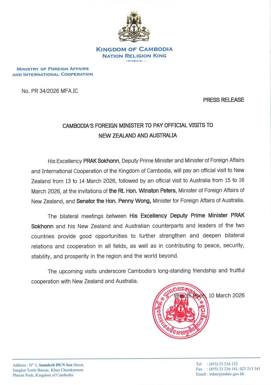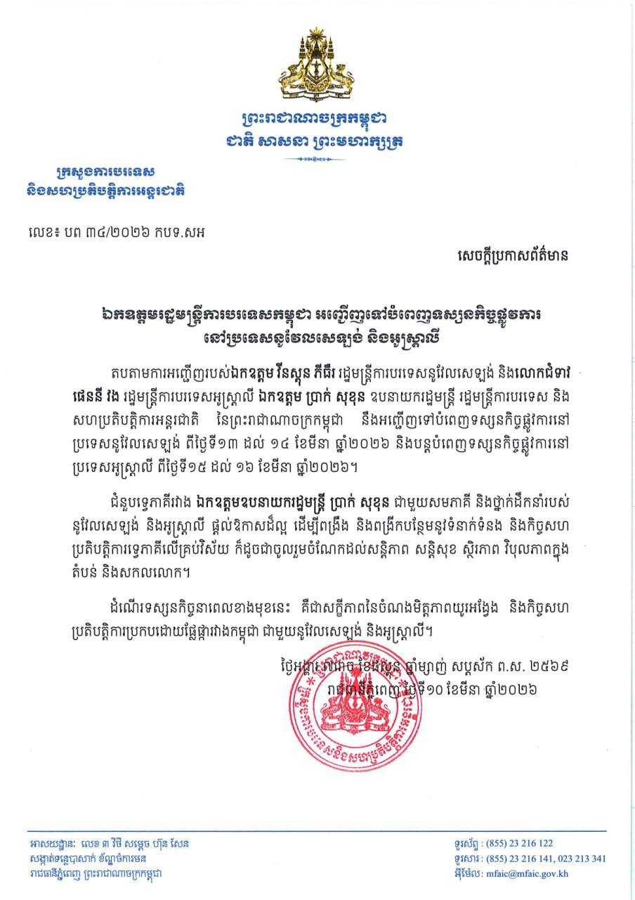 ភ្នំពេញ៖ តបតាមការអញ្ជើញរបស់លោក វីនស្តុន ភីធឺរ រដ្ឋមន្ត្រីការបរទេសនូវែលសេឡង់ និងលោកស្រី ផេននី វង រដ្ឋមន្ត្រីការបរទេសអូស្ត្រាលី លោក ប្រាក់ សុខុន ឧបនាយករដ្ឋមន្ត្រី រដ្ឋមន្ត្រីការបរទេស និង សហប្រតិបត្តិការអន្តរជាតិ នៃព្រះរាជាណាចក្រកម្ពុជា នឹងអញ្ជើញទៅបំពេញទស្សនកិច្ចផ្លូវការ ប្រទេសនូវែលសេឡង់ ពីថ្ងៃទី១៣ ដល់ ១៤ ខែមីនា ឆ្នាំ២០២៦ និងបន្តបំពេញទស្សនកិច្ចផ្លូវការនៅ ប្រទេសអូស្ត្រាលី ពីថ្ងៃទី១៥ ដល់ ១៦ ខែមីនា ឆ្នាំ២០២៦។